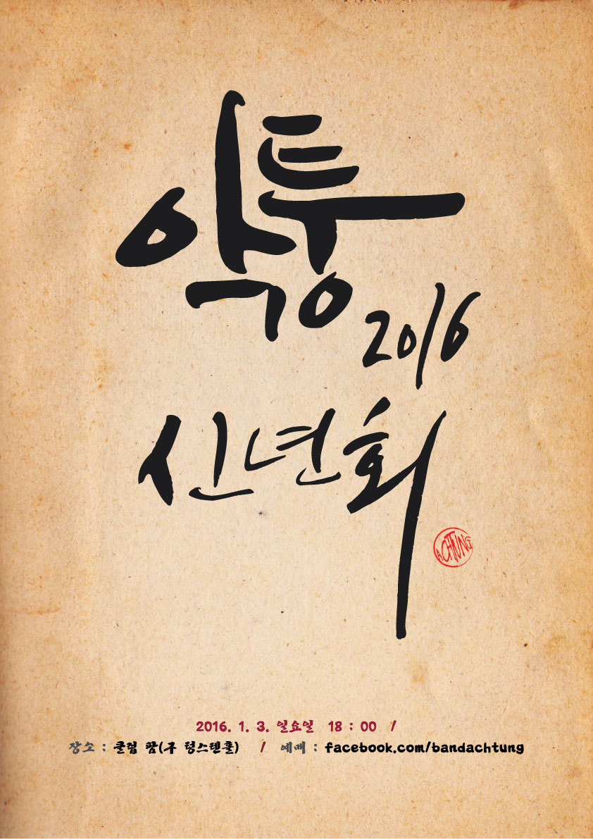 2016 악퉁 신년회 작성자chews|작성시간15.12.10|조회수109 목록 댓글 1 글자크기 작게가 글자크기 크게가 오랜만에 카페에 공연공지를 올리네요.^^facebook/bandachtung 으로 찾아가시면 됩니다. 다음검색 현재 게시글 추가 기능 열기 북마크 공유하기 신고 센터로 신고 댓글 댓글 1 댓글쓰기 답글쓰기 댓글 리스트 작성자Beatrice | 작성시간 15.12.10 곧봐요! 댓글 전체보기