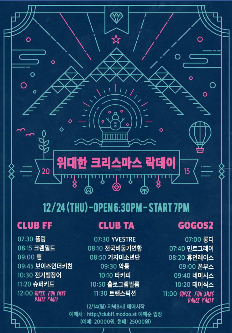 12.24. '위대한락데이' 클럽타 작성자chews|작성시간15.12.15|조회수82 목록 댓글 0 글자크기 작게가 글자크기 크게가 새로운 악퉁의 첫 공연은 크리스마스 이브입니다.악퉁은 클럽타에서 PM 9:30 에 출연합니다.메리크리스마스. 다음검색 현재 게시글 추가 기능 열기 북마크 공유하기 신고 센터로 신고 댓글 댓글 0 댓글쓰기 답글쓰기 댓글 리스트