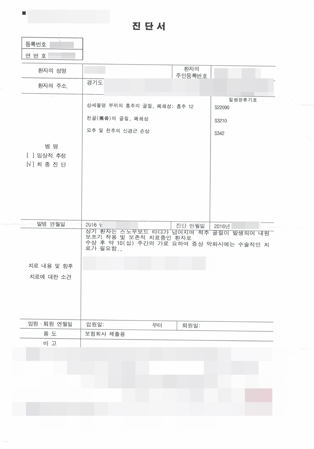 사례자분의 경우 스키장에서 발생한 척추압박골절로 병원에 내원한 결과