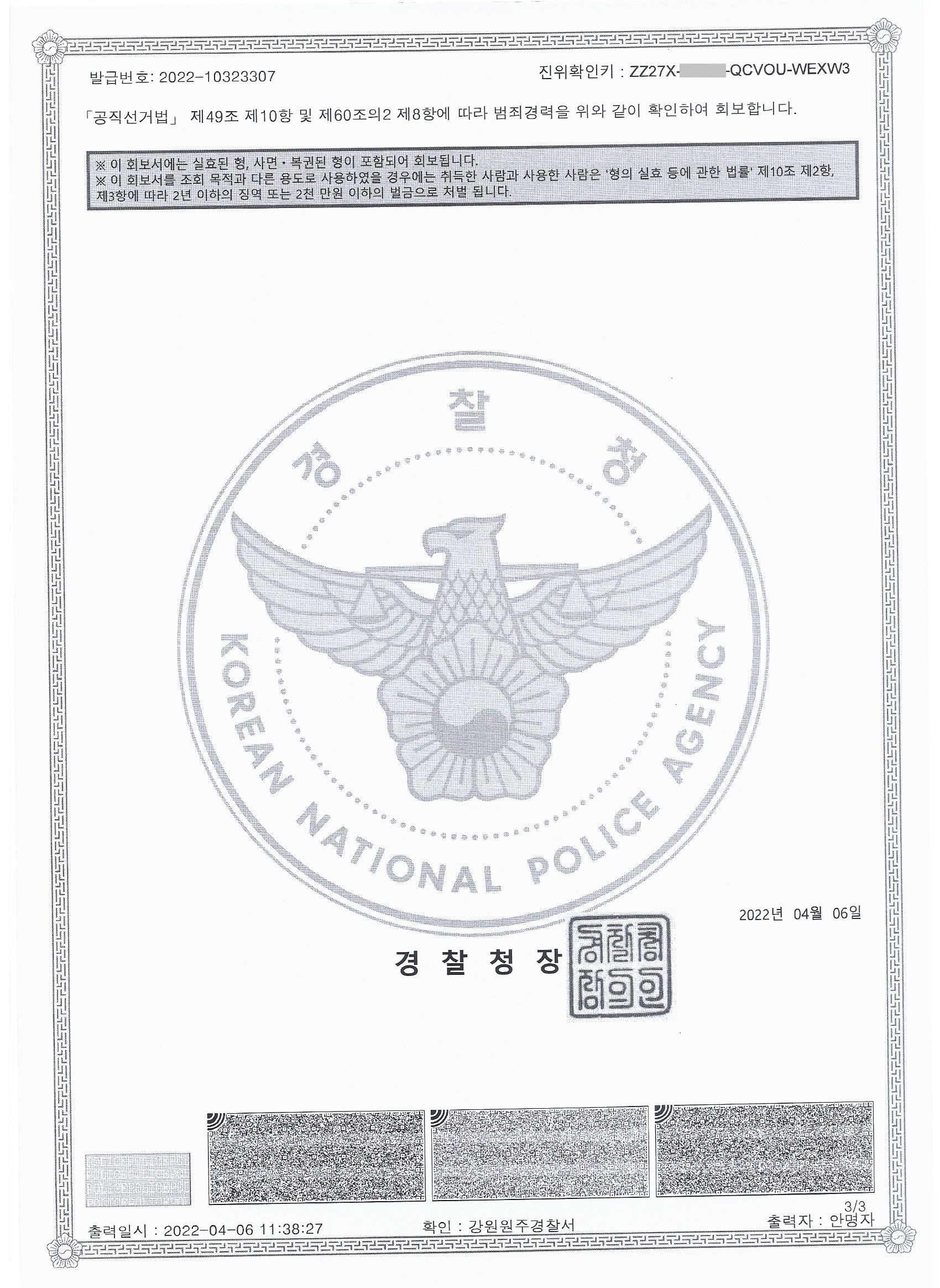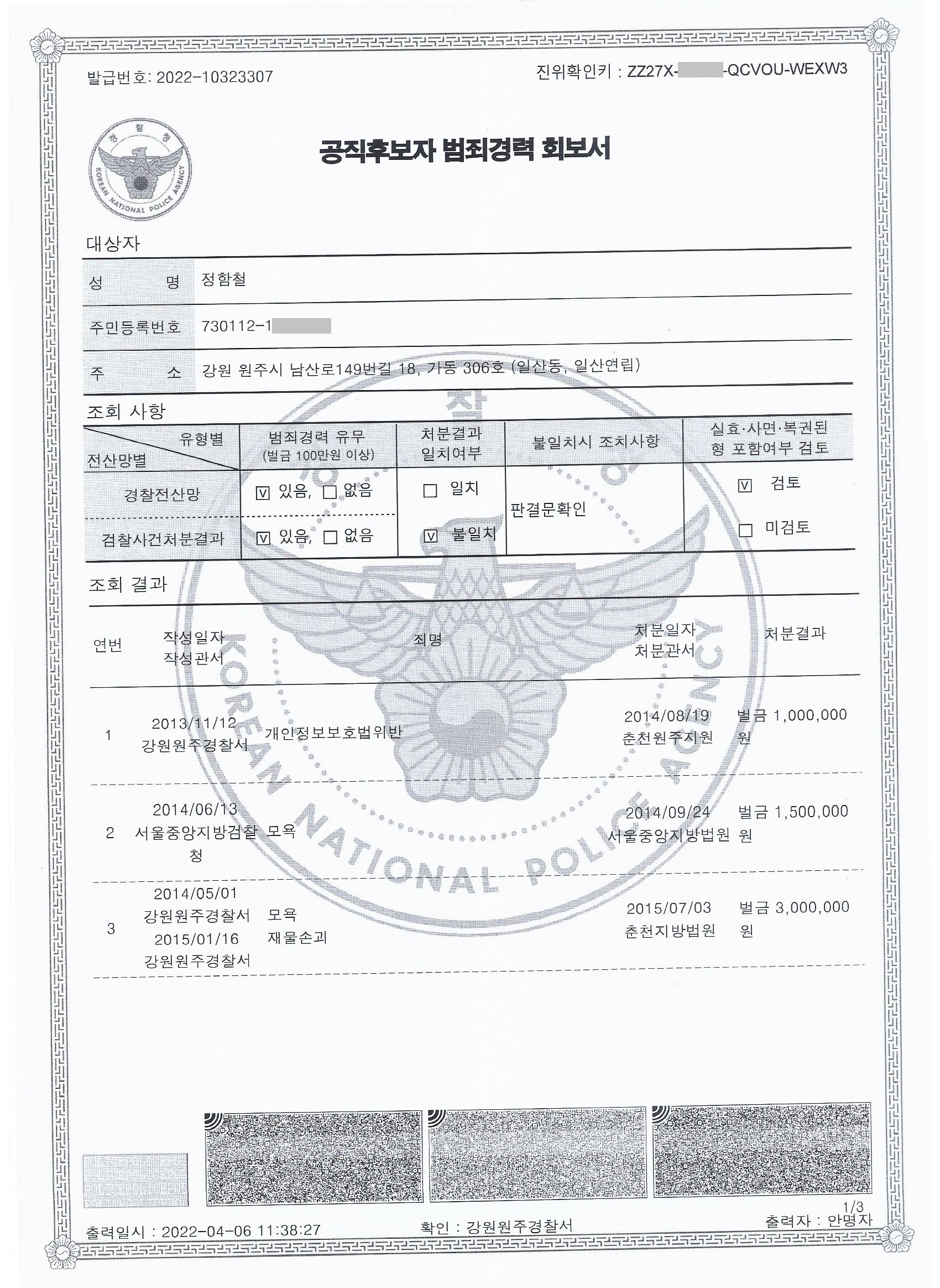 제21대 국회의원선거 원주시갑선거구 후보예정자 정함철 정보공개자료 전과 18범에 대한 소명자료 (서북청년단 구국결사대장)