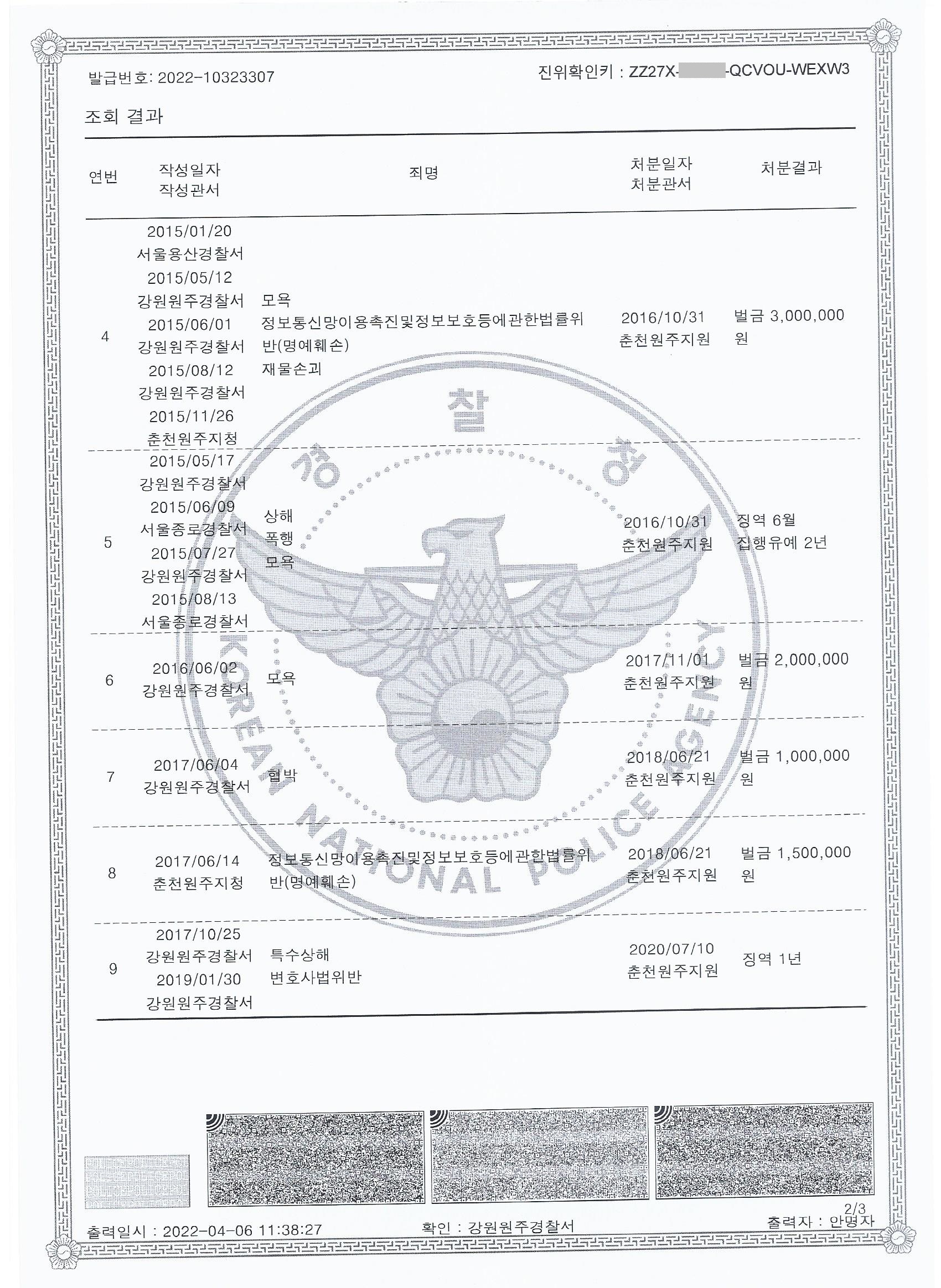 2004년 3월 박사모(박근혜를사랑하는모임) 창립발기인으로 참여한 이후, 16년간 시민운동가로 활동하던 과정에서 부득이하게 감수하게 된 전과기록이며, 2015년 이후의 모욕, 재물손괴, 명예훼손, 상해, 폭행, 협박 등은 기본적으로 2014년 11월 28일에 공식 재건된 서북청년단 대변인 겸 구국결사대장으로 활동하고 있는 이유로 인해, 대한민국 근현대사에 대한 심각한 역사왜곡에 노출된 경찰과 검찰, 판사 등의 그릇된 오판으로 부당하게 모두 유죄로 처분 받은 것이나 탄핵정국을 맞아 재판에 집중할 수 없어 포기했던 사건입니다.