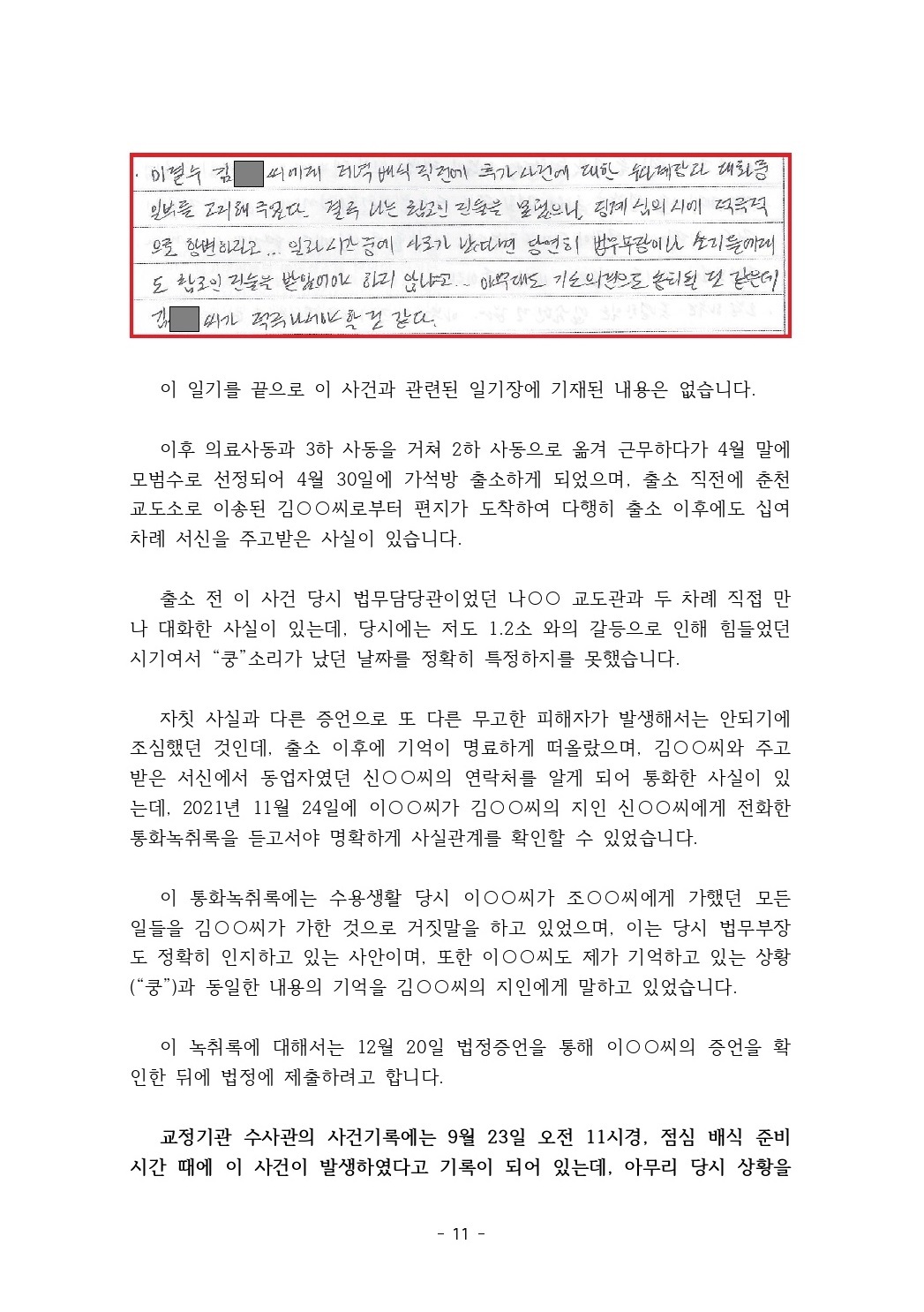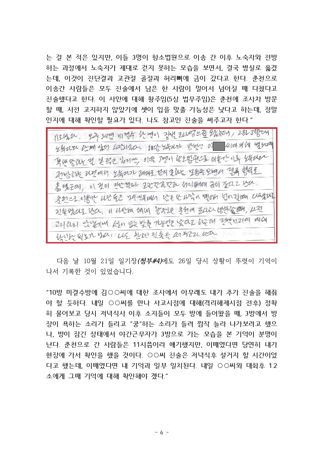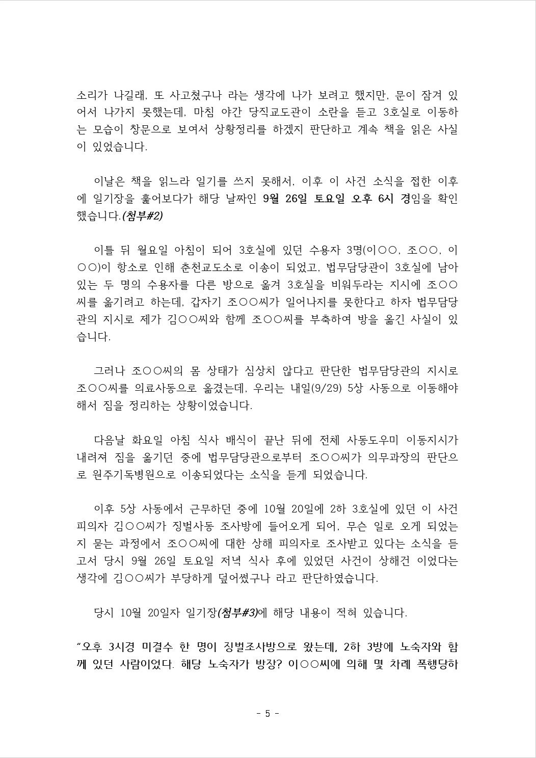 수용기간 중 있었던 사건에 대하여 증언 및 탄원서 제출