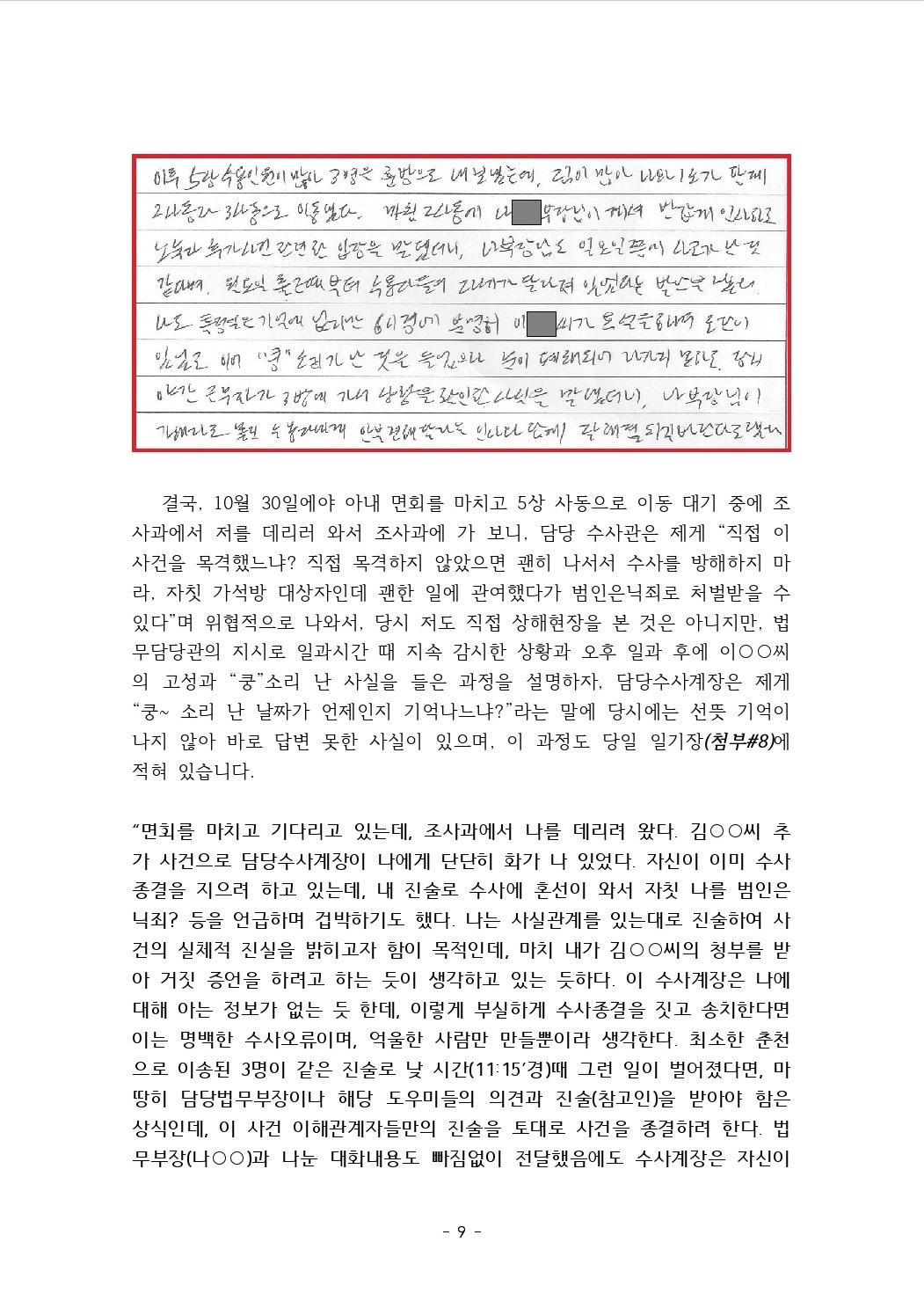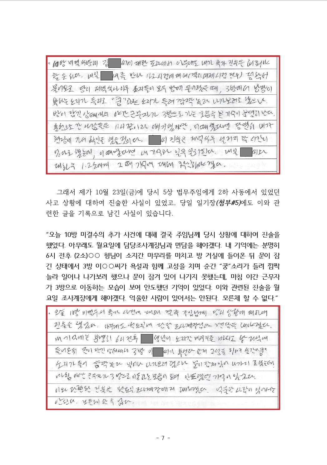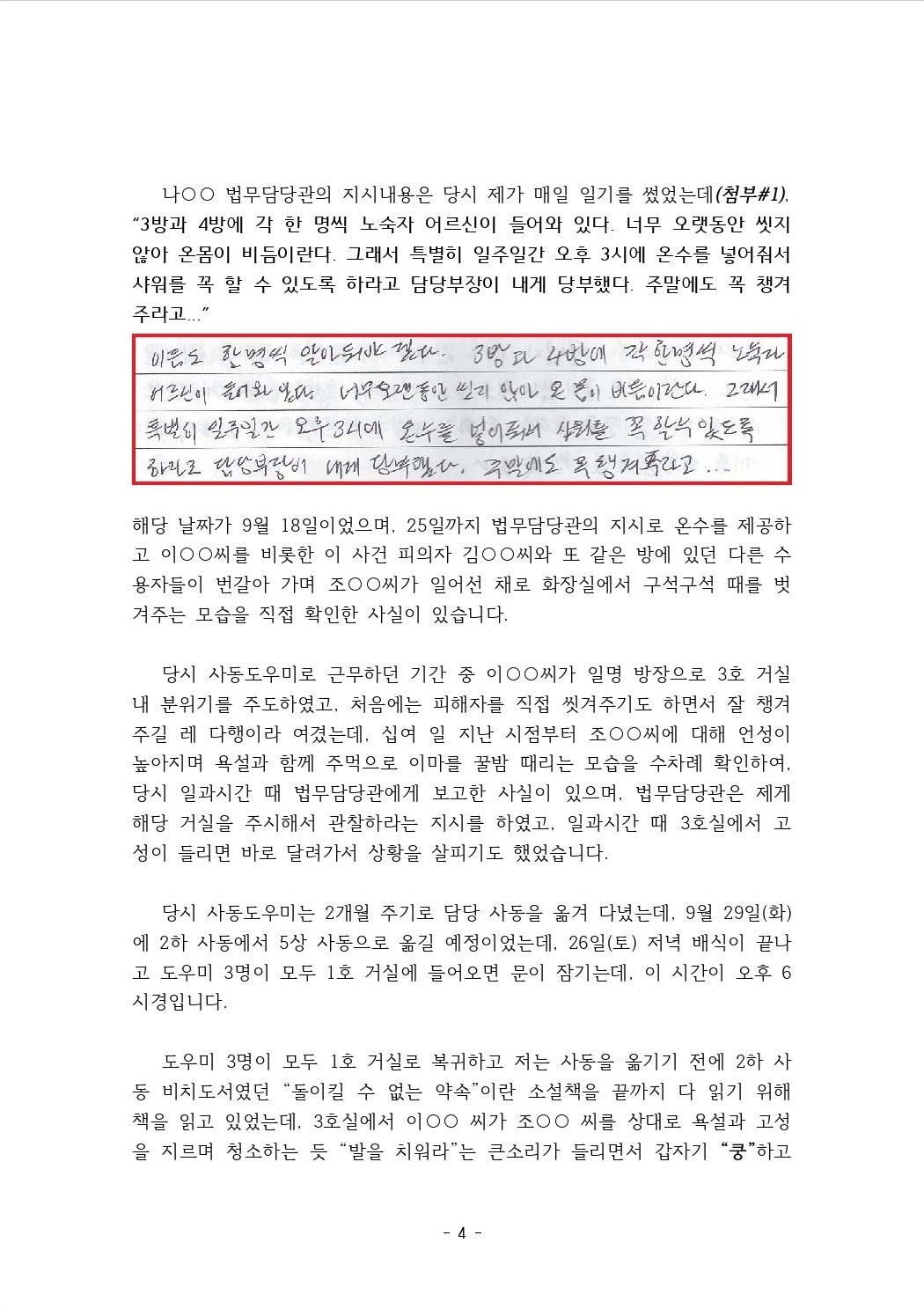 수용기간 중 있었던 사건에 대하여 증언 및 탄원서 제출