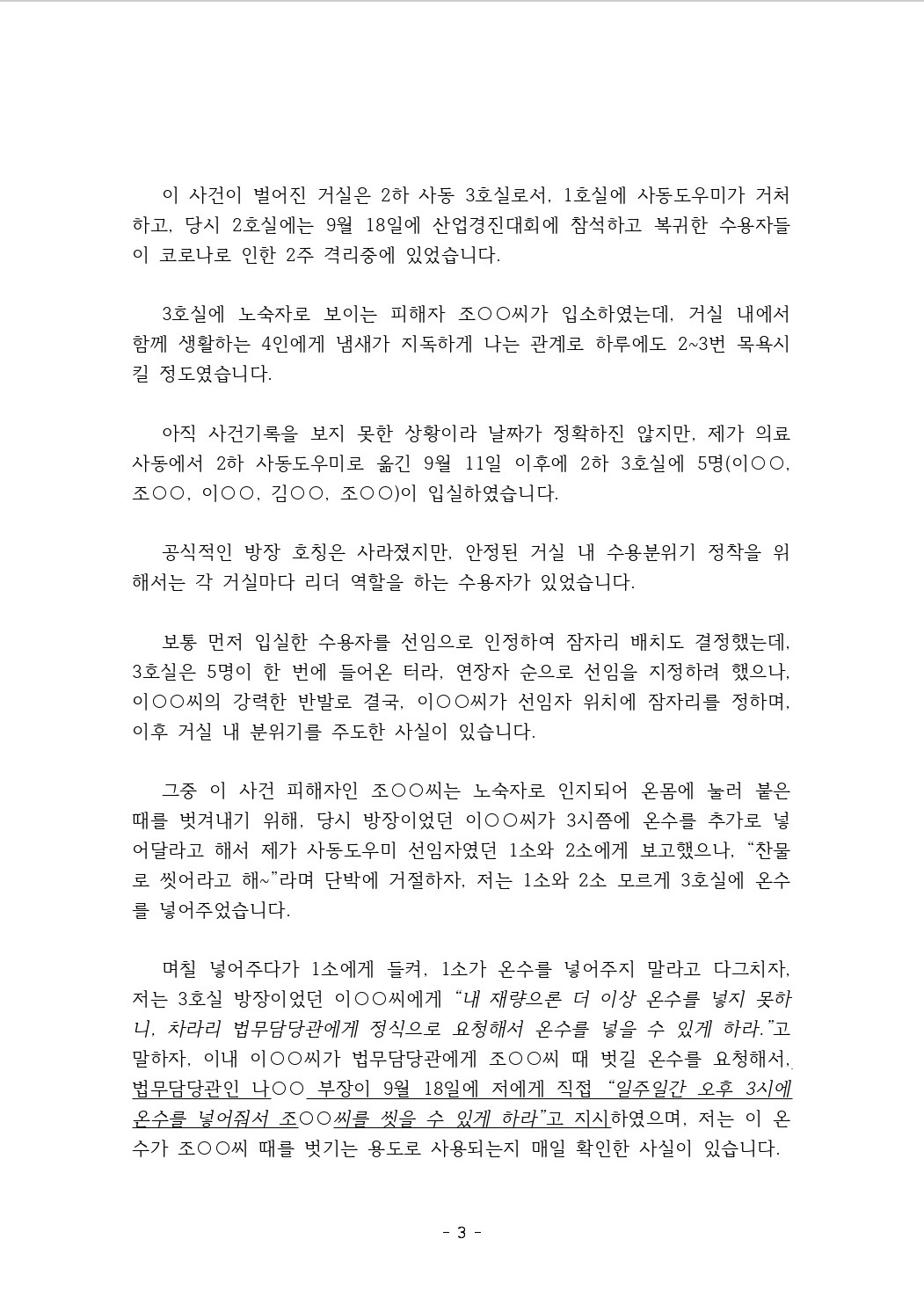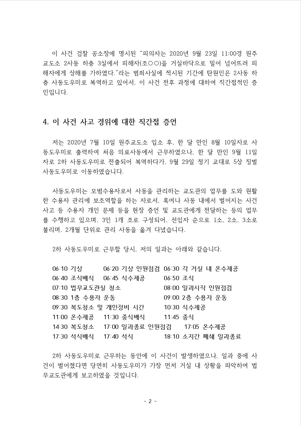수용기간(20.07.10~21.04.30) 중에 원주교도소 내에서 중상해사건이 발생했는데, 동료 수용자가 억울하게 죄를 덮어쓰게 되었으나,