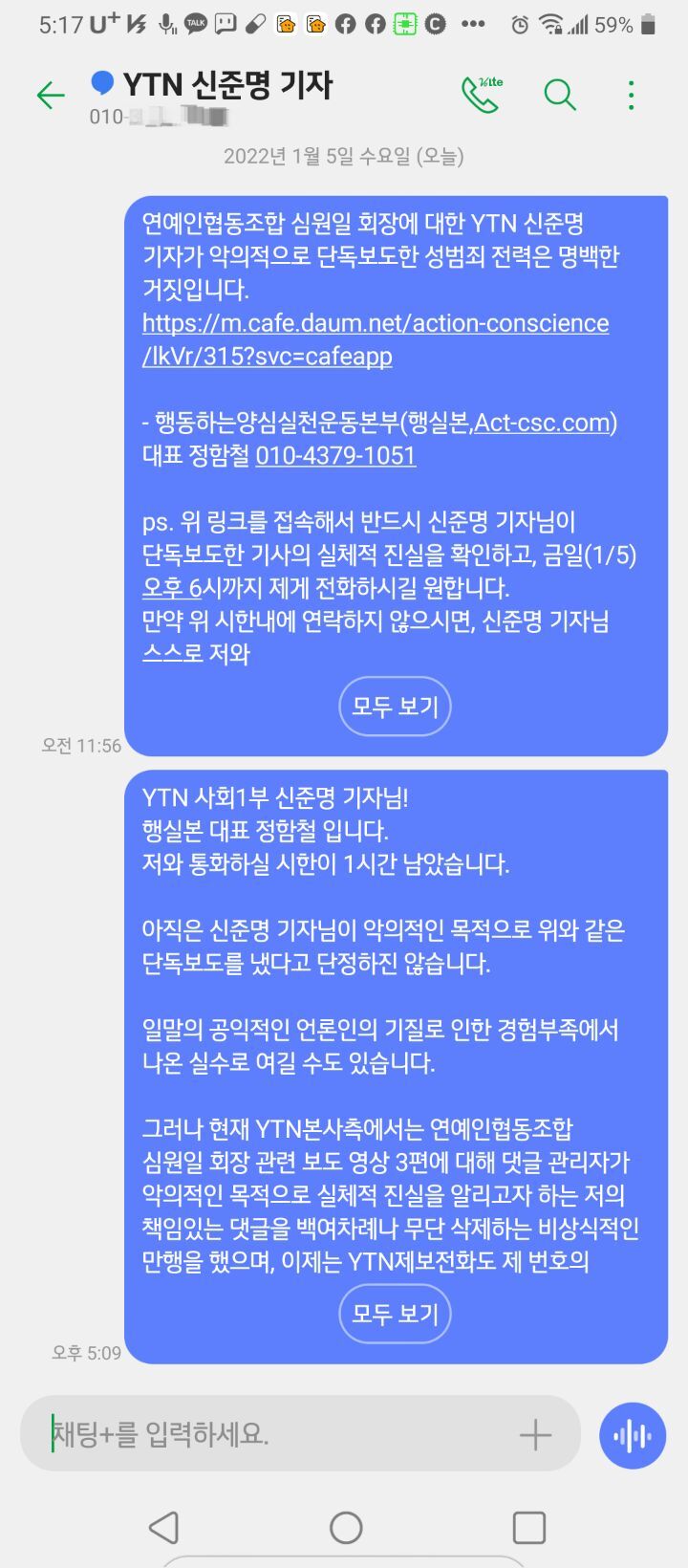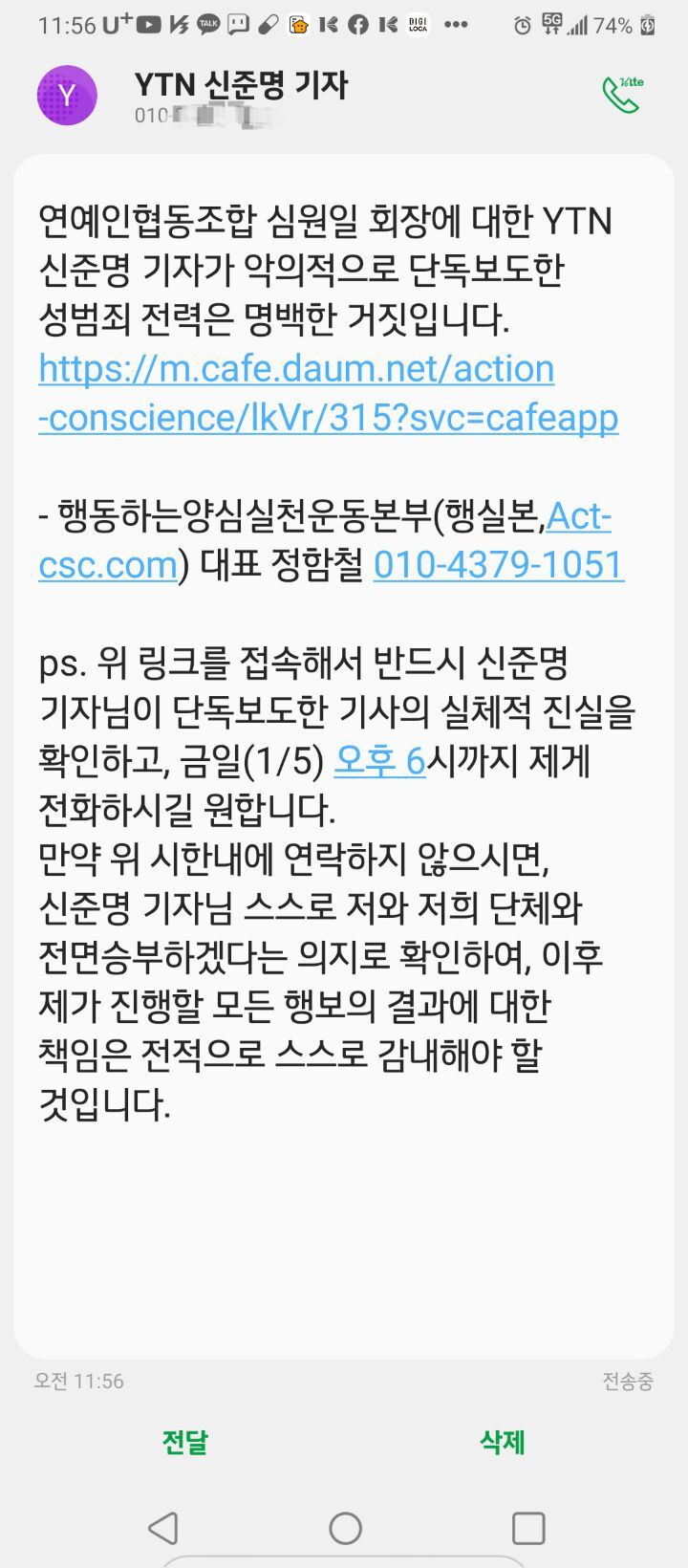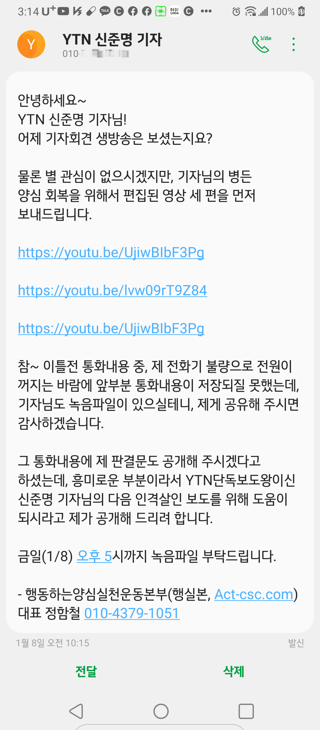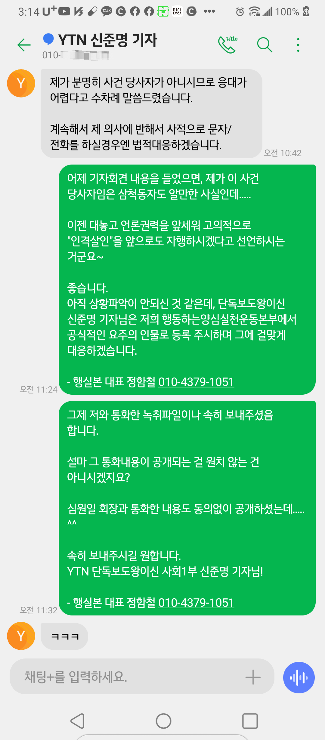 심원일 회장은 자신의 인격을 악의적으로 살해하려는 신준명 기자의 연락처를 확인해 달라는 저의 요청을, 기자의 개인정보 보호라는 취지로 끝까지 거부하였으나, 어제(1/4) 자정쯤에 심원일 회장이 잠시 자리를 비운 틈에 제가 신준명 기자의 전번을 확인한 사실이 있습니다.