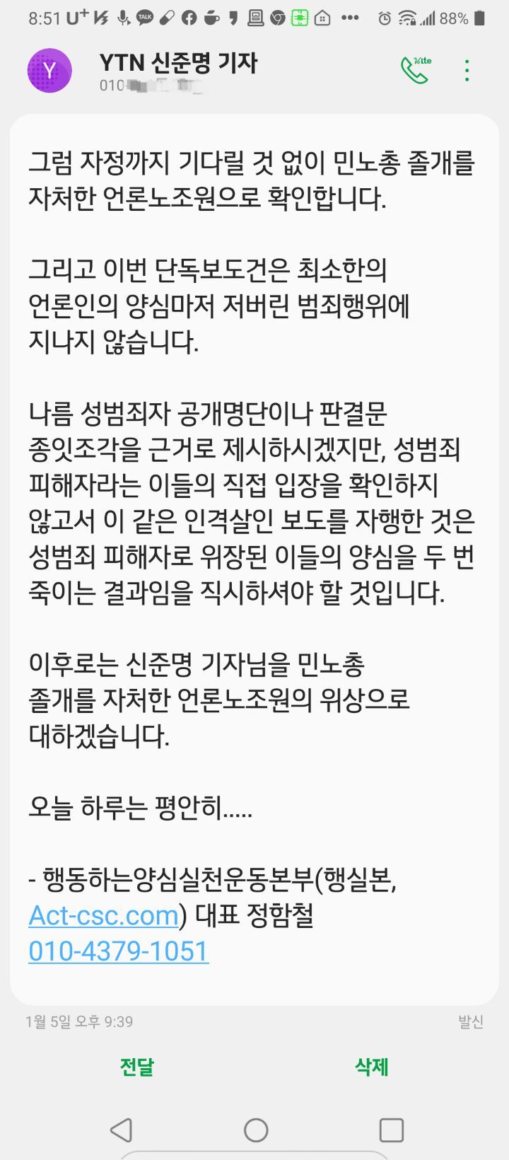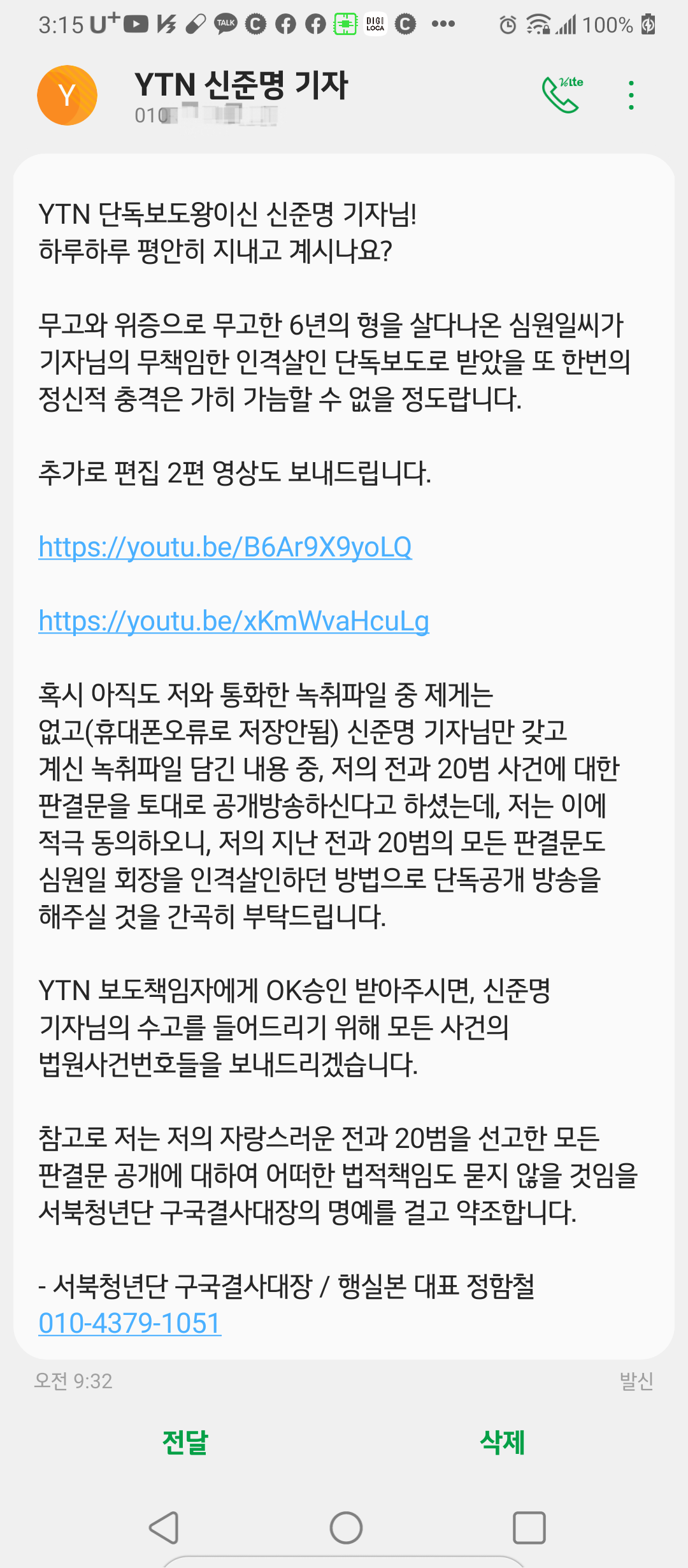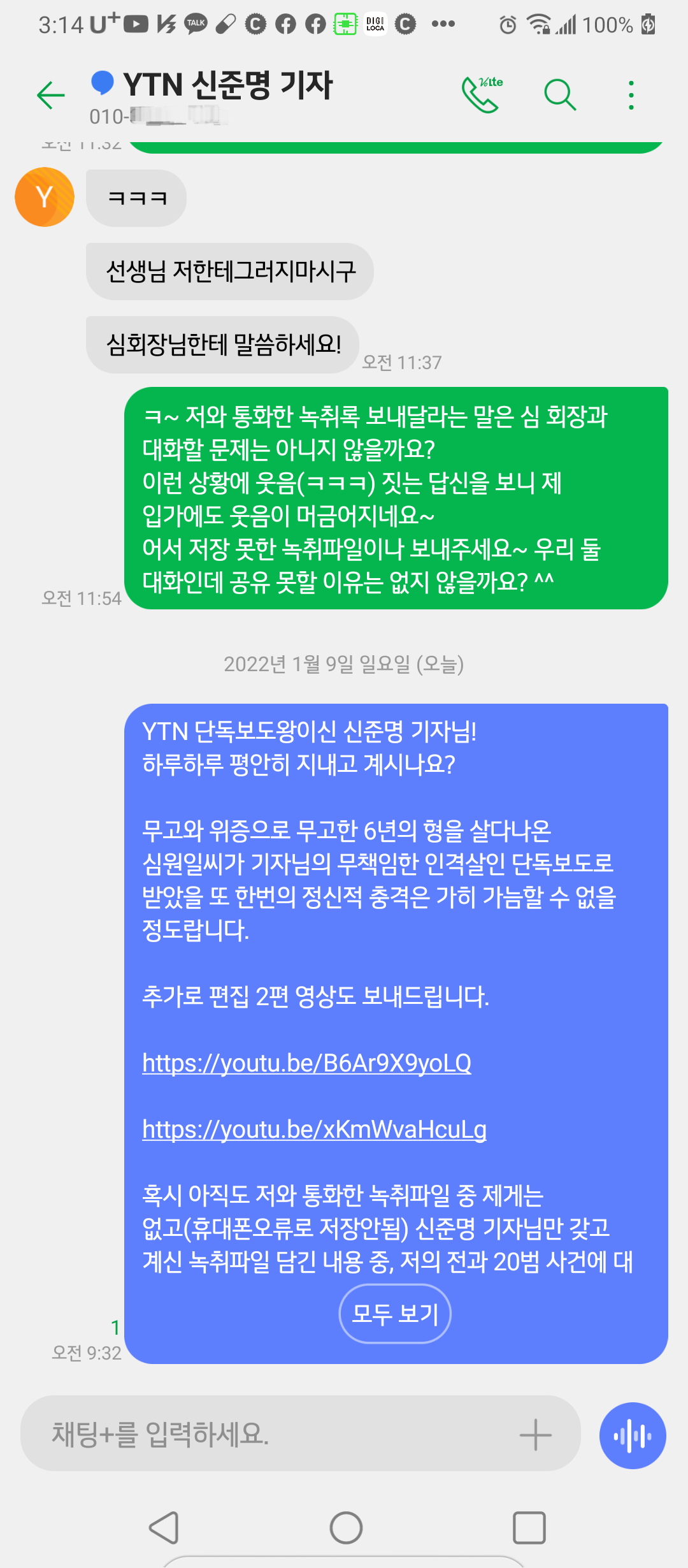 심원일 회장은 자신의 인격을 악의적으로 살해하려는 신준명 기자의 연락처를 확인해 달라는 저의 요청을, 기자의 개인정보 보호라는 취지로 끝까지 거부하였으나, 어제(1/4) 자정쯤에 심원일 회장이 잠시 자리를 비운 틈에 제가 신준명 기자의 전번을 확인한 사실이 있습니다.