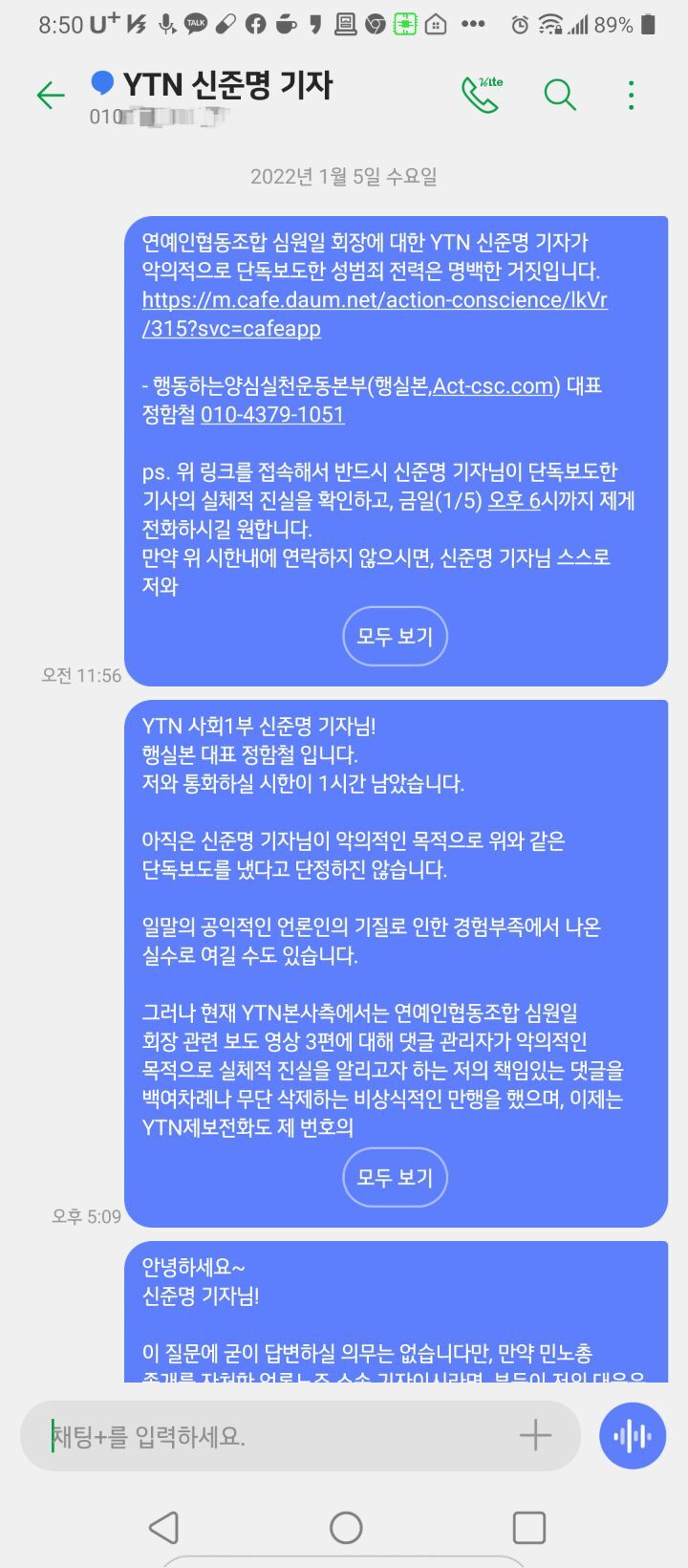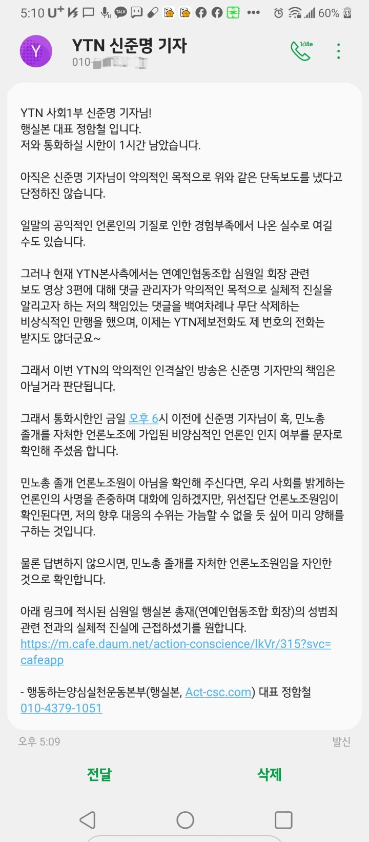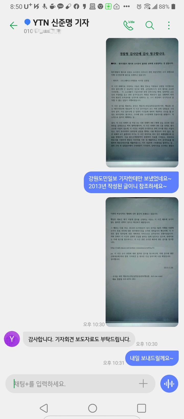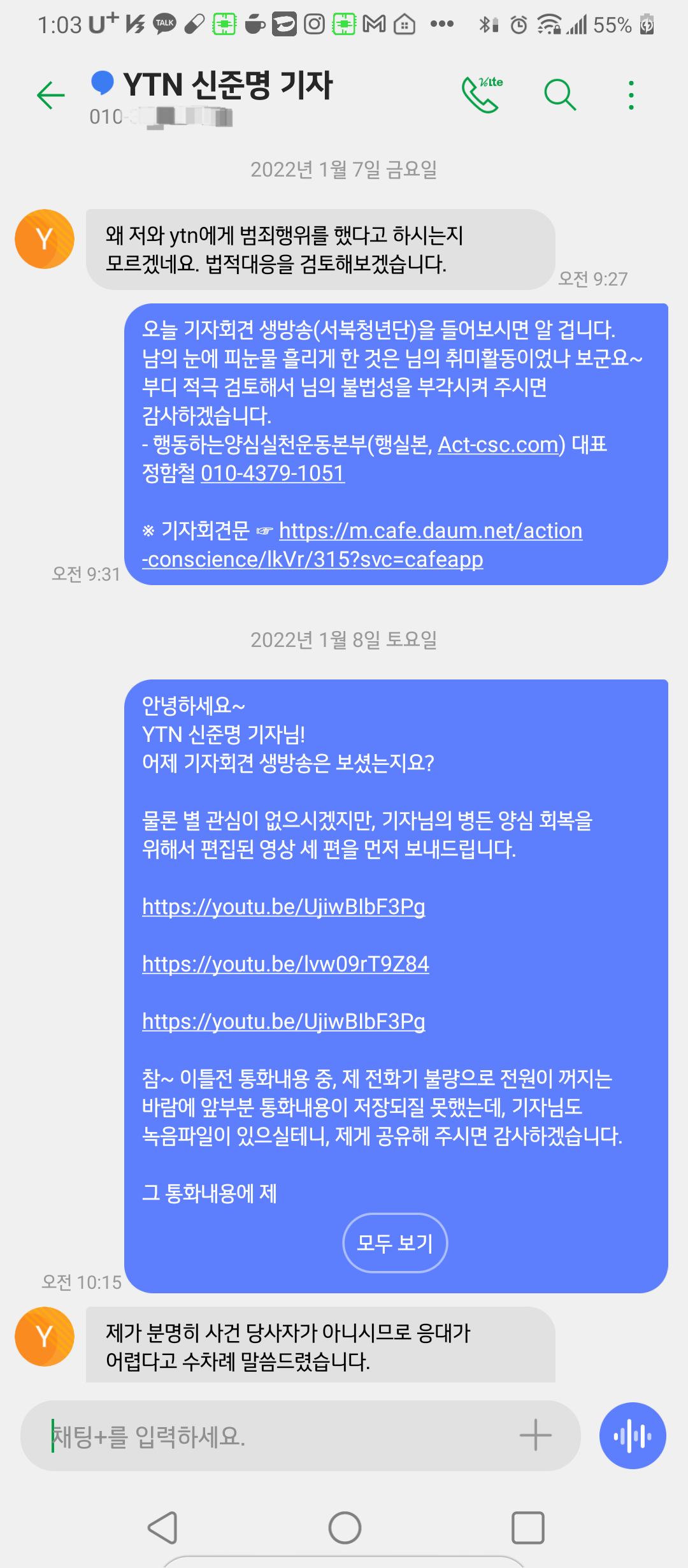 심원일 회장은 자신의 인격을 악의적으로 살해하려는 신준명 기자의 연락처를 확인해 달라는 저의 요청을, 기자의 개인정보 보호라는 취지로 끝까지 거부하였으나, 어제(1/4) 자정쯤에 심원일 회장이 잠시 자리를 비운 틈에 제가 신준명 기자의 전번을 확인한 사실이 있습니다.
