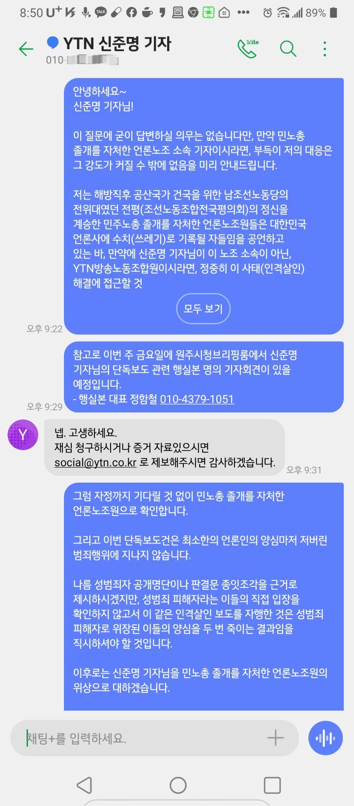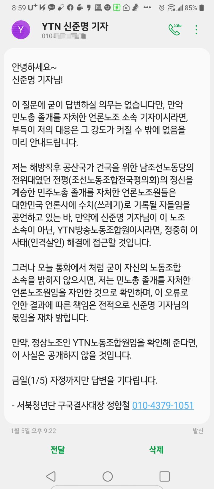 이후 저는 망국집단인 민노총 졸개를 자처한 언론노조 소속의 패악적인 행태에 대하여 저 만의 방법으로 대처해 나갈 것임을 천명합니다.