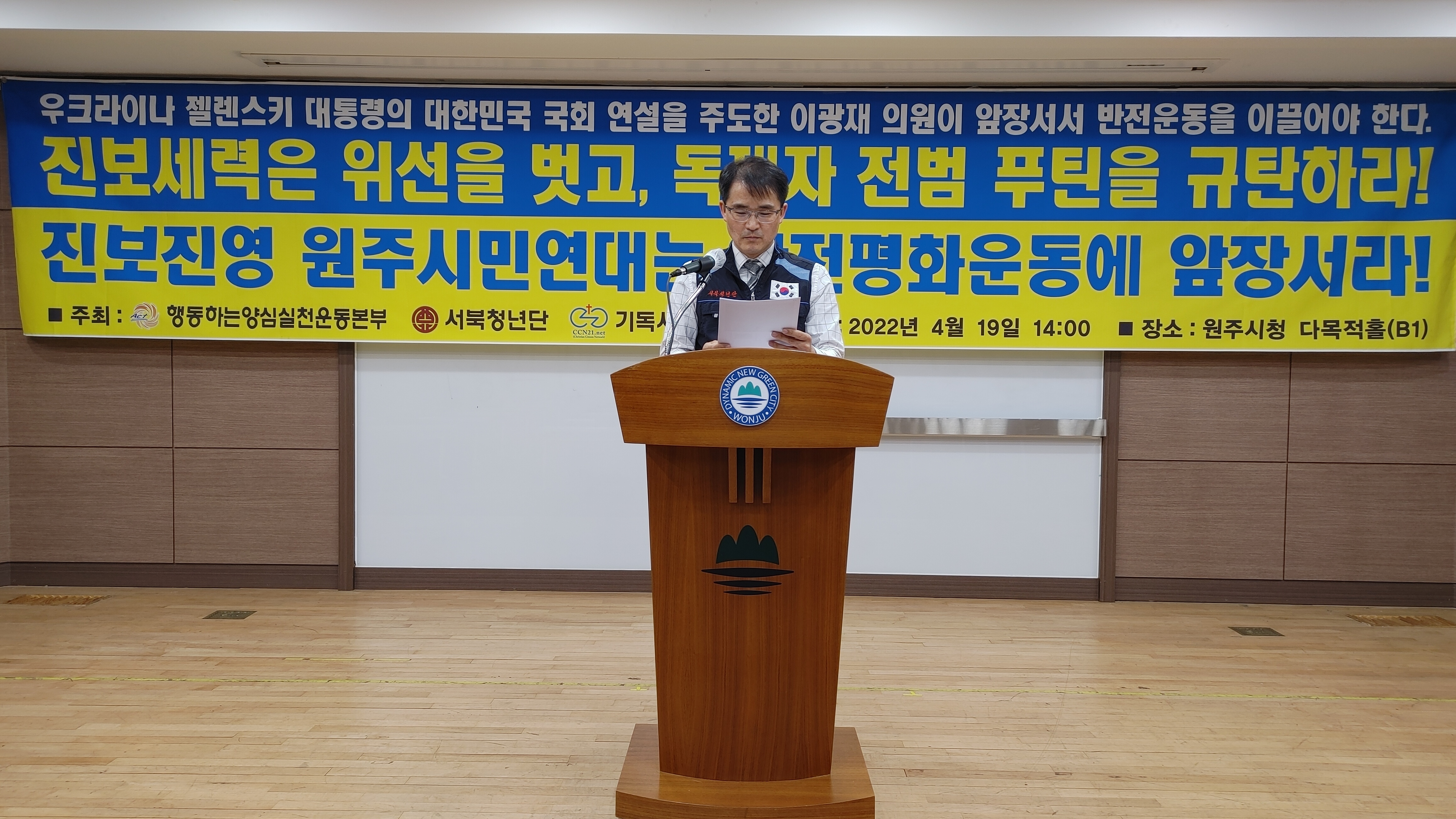 “진보좌파세력은 위선의 가면을 벗고 독재자 전범 푸틴을 규탄하라!”