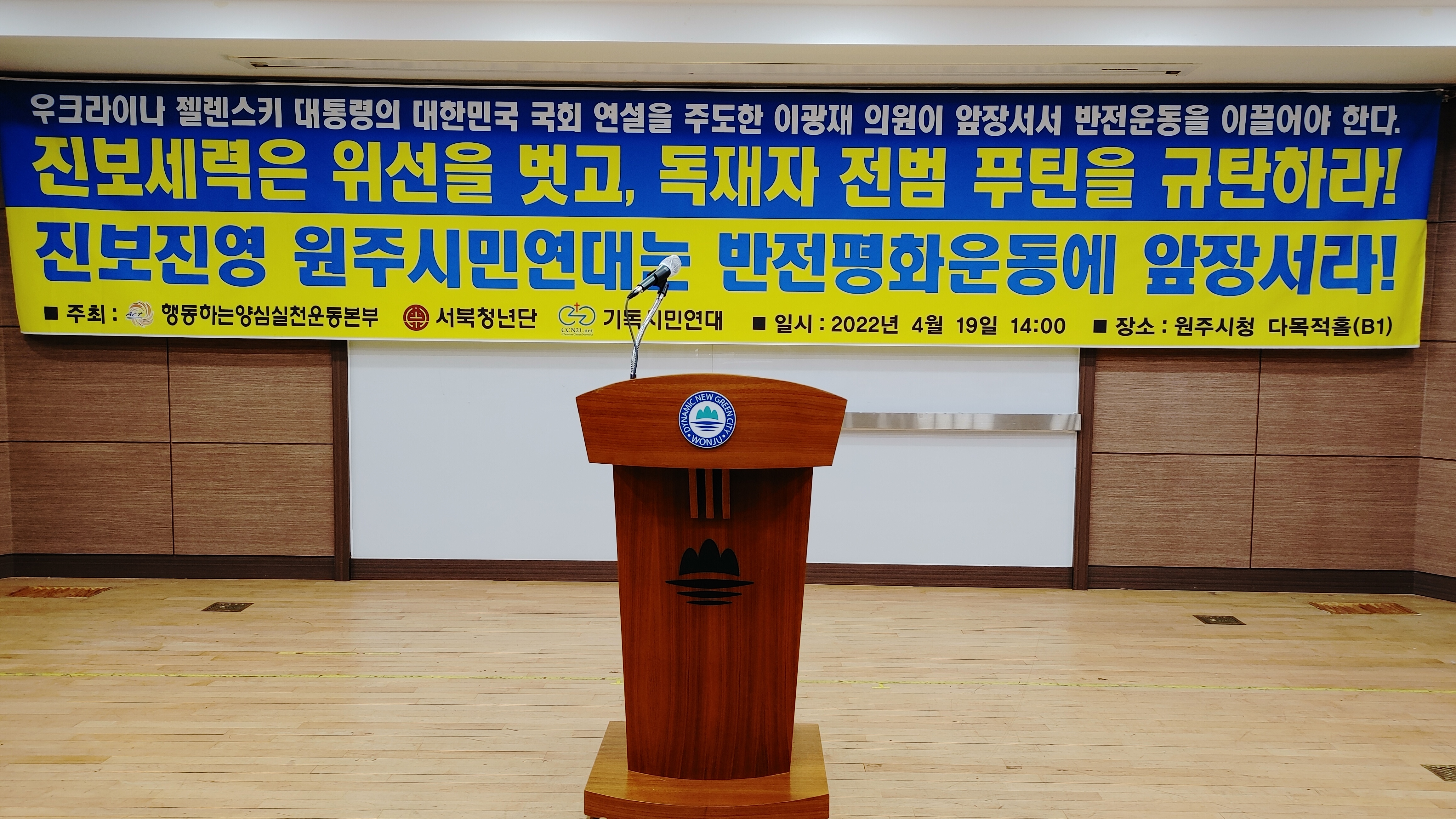 원주시민연대 측의 주도적인 반전평화집회를 위하여 금일 기자회견 직후에 원주의료원 사거리에 게시된 저희 단체 현수막은 임시 철거할 것입니다.
