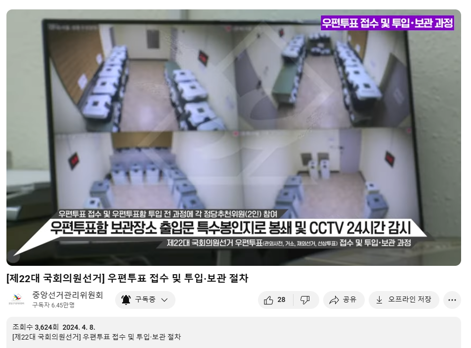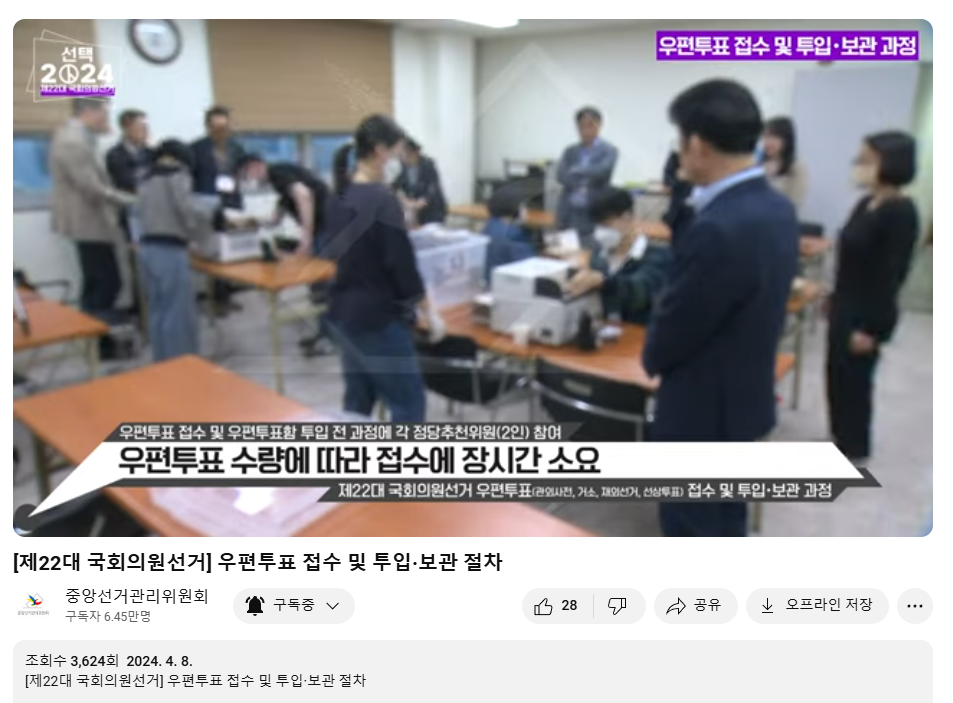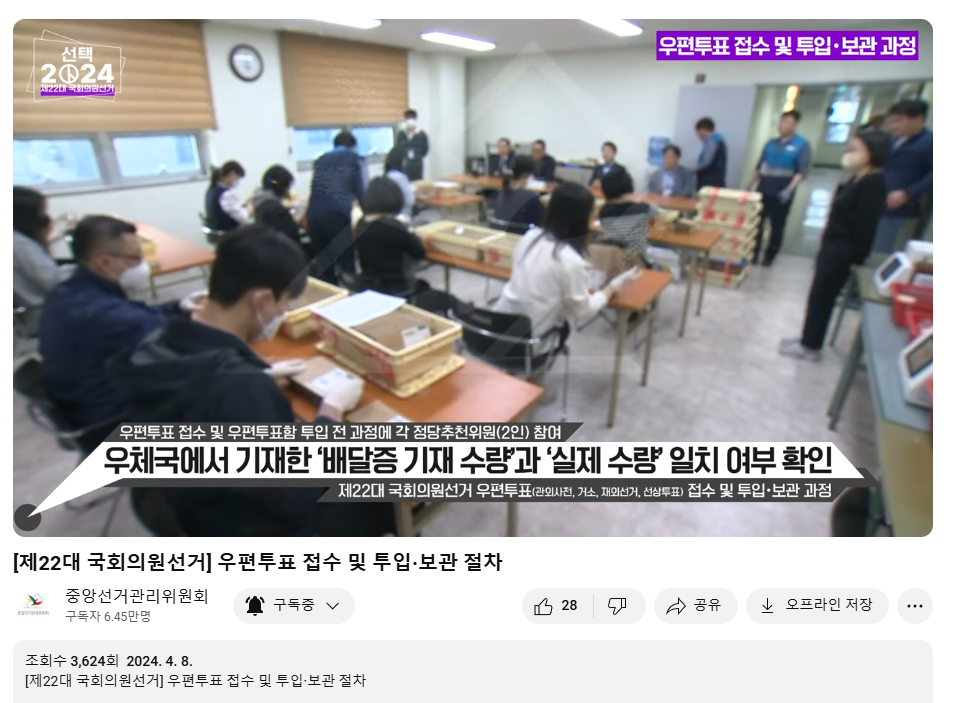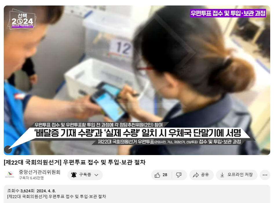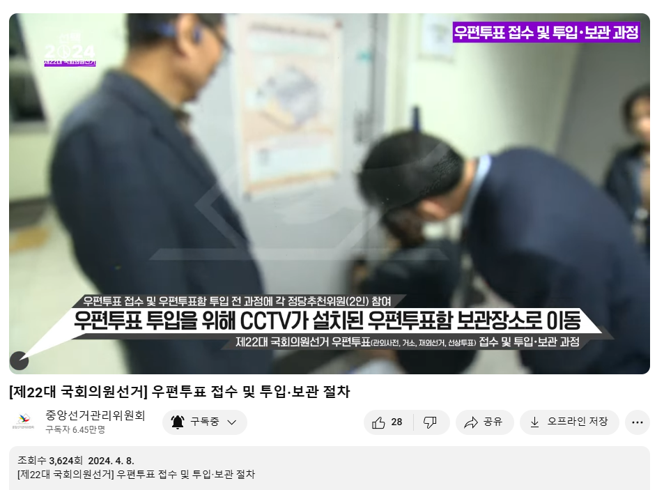2024년 제22대 국회의원선거 당시 관외우편투표 처리 절차를 사전선거일(4/5~6) 전에 홍보하지 않고, 사전선거 종료 직후 보수진영에서 "선관위가 관외사전투표를 바꿔치기 하고 있다"며 선동당하자, 4월 8일에 되서야 책임회피 목적으로 관외우편투표 처리 절차 영상을 공개한 선관위!