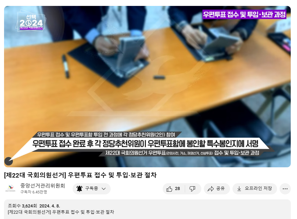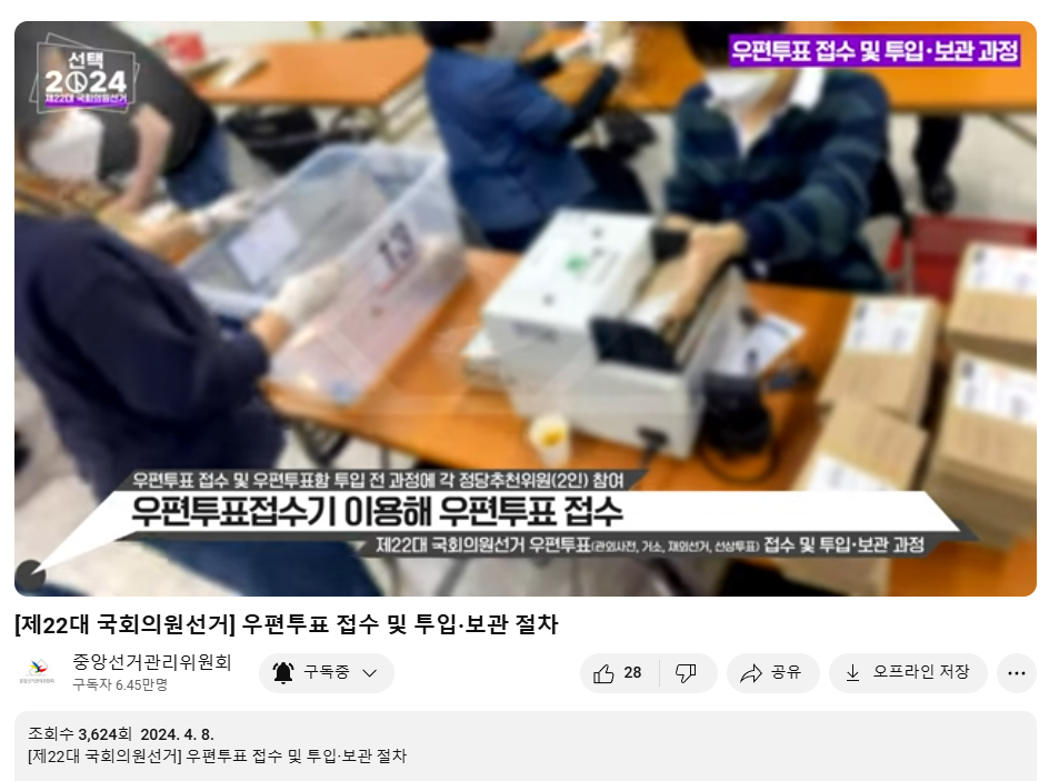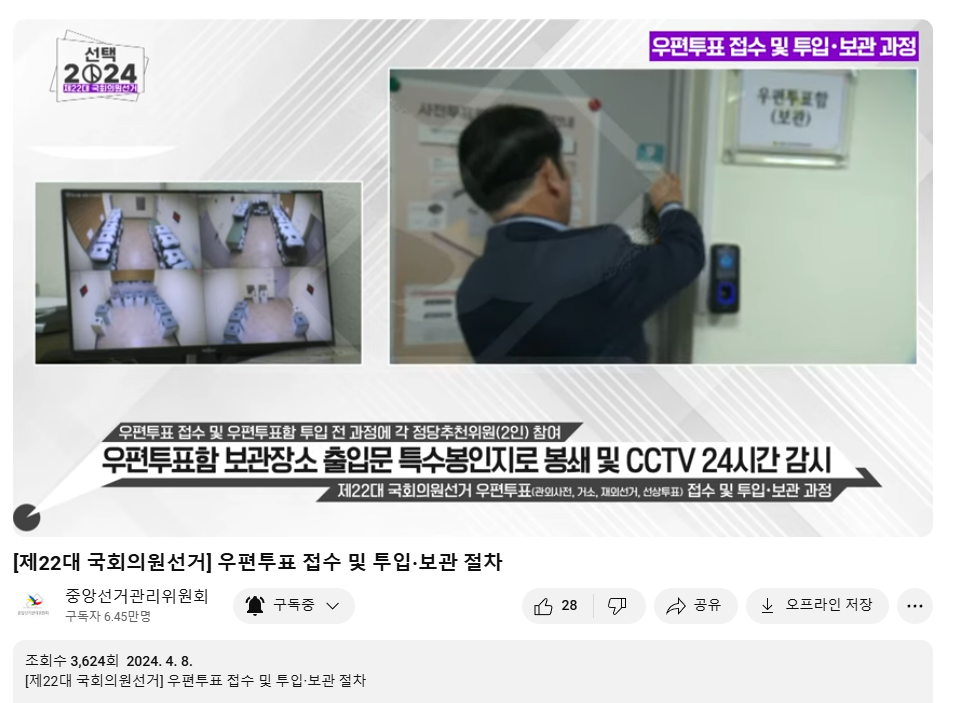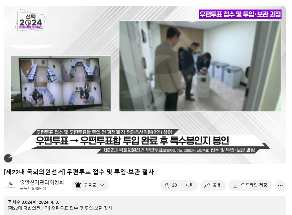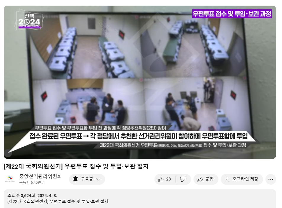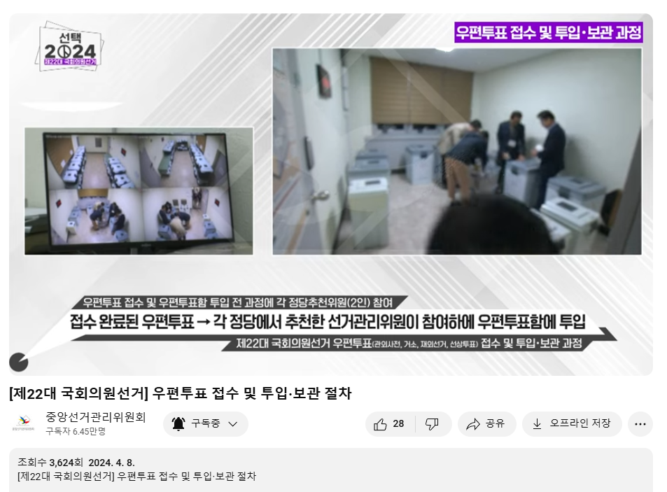 2024년 제22대 국회의원선거 당시 관외우편투표 처리 절차를 사전선거일(4/5~6) 전에 홍보하지 않고, 사전선거 종료 직후 보수진영에서 "선관위가 관외사전투표를 바꿔치기 하고 있다"며 선동당하자, 4월 8일에 되서야 책임회피 목적으로 관외우편투표 처리 절차 영상을 공개한 선관위!