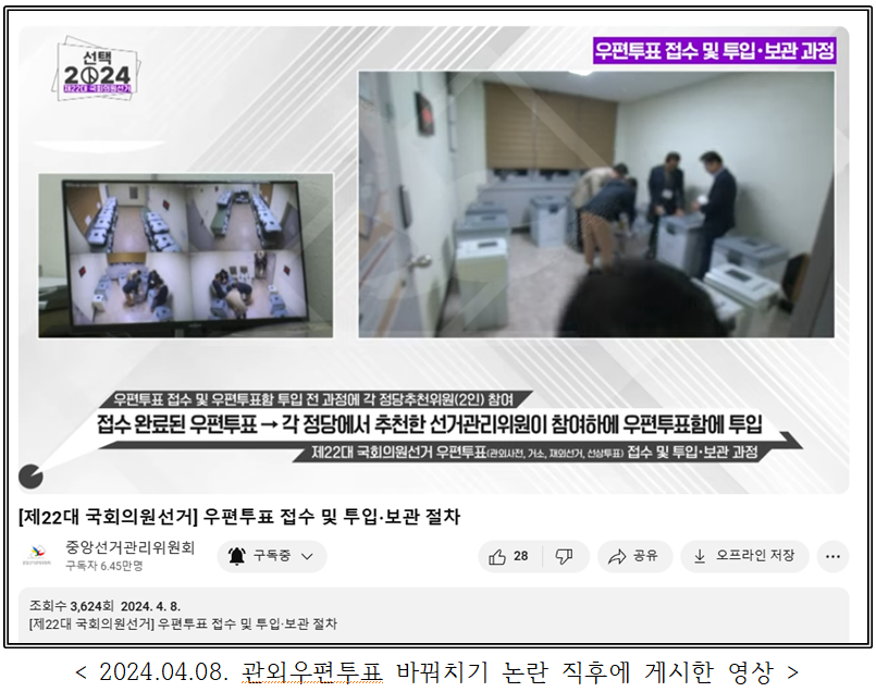 이 영상에서도 관외우편봉투는 선거 당일(4/10) 투표종료시각(18:00)까지 오(잘못)배송된 관외우편봉투가 관할 선관위에 도착해야 유효표로 인정되어 관외우편함에 투입하고, 18시 이후에 도착하는 관외우편봉투는 무효로 처리한다는 절차를 고의로 누락시켰다.