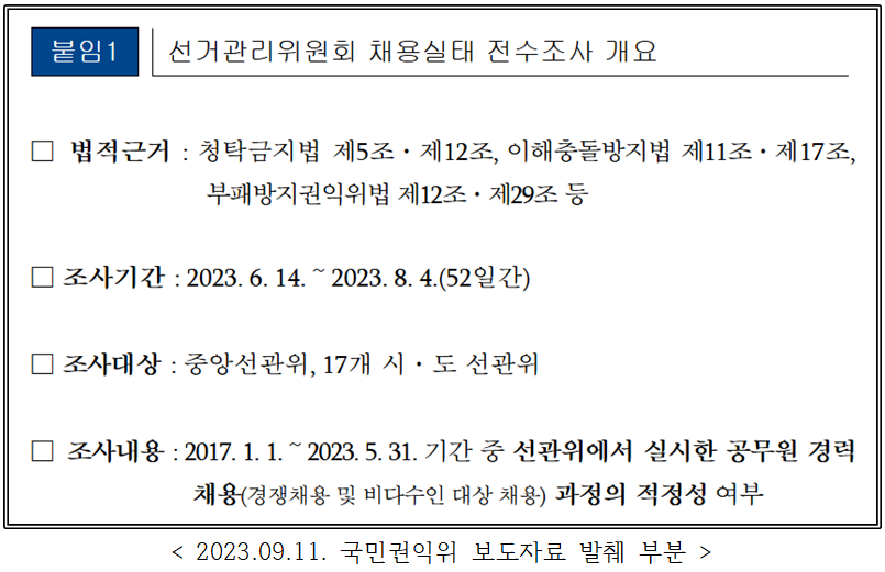 국민권익위에서 2023년 9월 11일에 보도자료로 배포한 선관위 채용 비리 353건 적발은 헌법기관인 선거관리위원회를 신뢰하고 있던 모든 국민을 분노케 하였으며, 2022년 제20대 대통령선거 당시 코로나 확진자 소쿠리 대리투표 논란으로 책임지고 사퇴한 김세환 사무총장의 자녀를 포함하여 28명의 고위직 선관위 공무원들이 고발되었다.