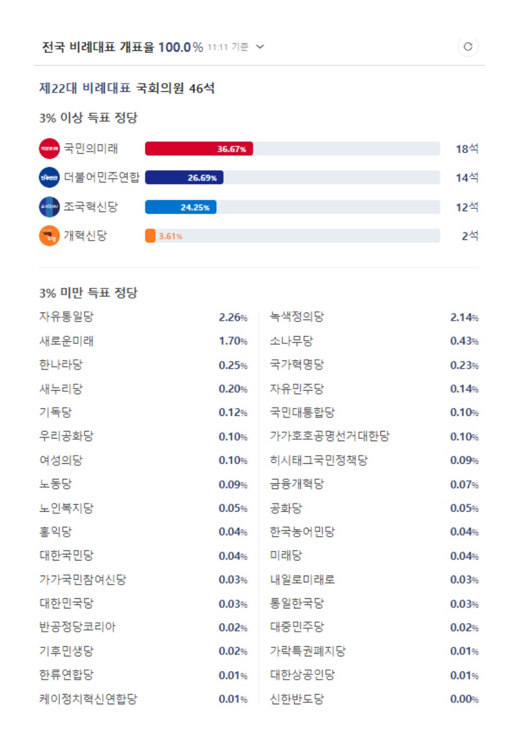 제22대 총선 38개 정당 참여 – 0.1%미만 득표 21개 정당, 0.1~1%미만 득표 10개 정당