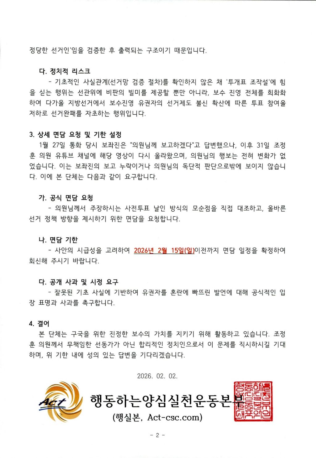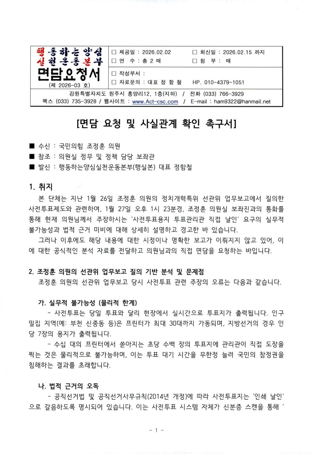 본 단체는 지난 1월 26일 조정훈 의원의 정치개혁특위 선관위 업무보고에서 질의한 사전투표제도와 관련하여, 1월 27일 오후 1시 23분경, 조정훈 의원실 보좌진과의 통화를 통해 현재 의원님께서 주장하시는 '사전투표용지 투표관리관 직접 날인' 요구의 실무적 불가능성과 법적 근거 미비에 대해 상세히 설명하고 경고한 바 있습니다.