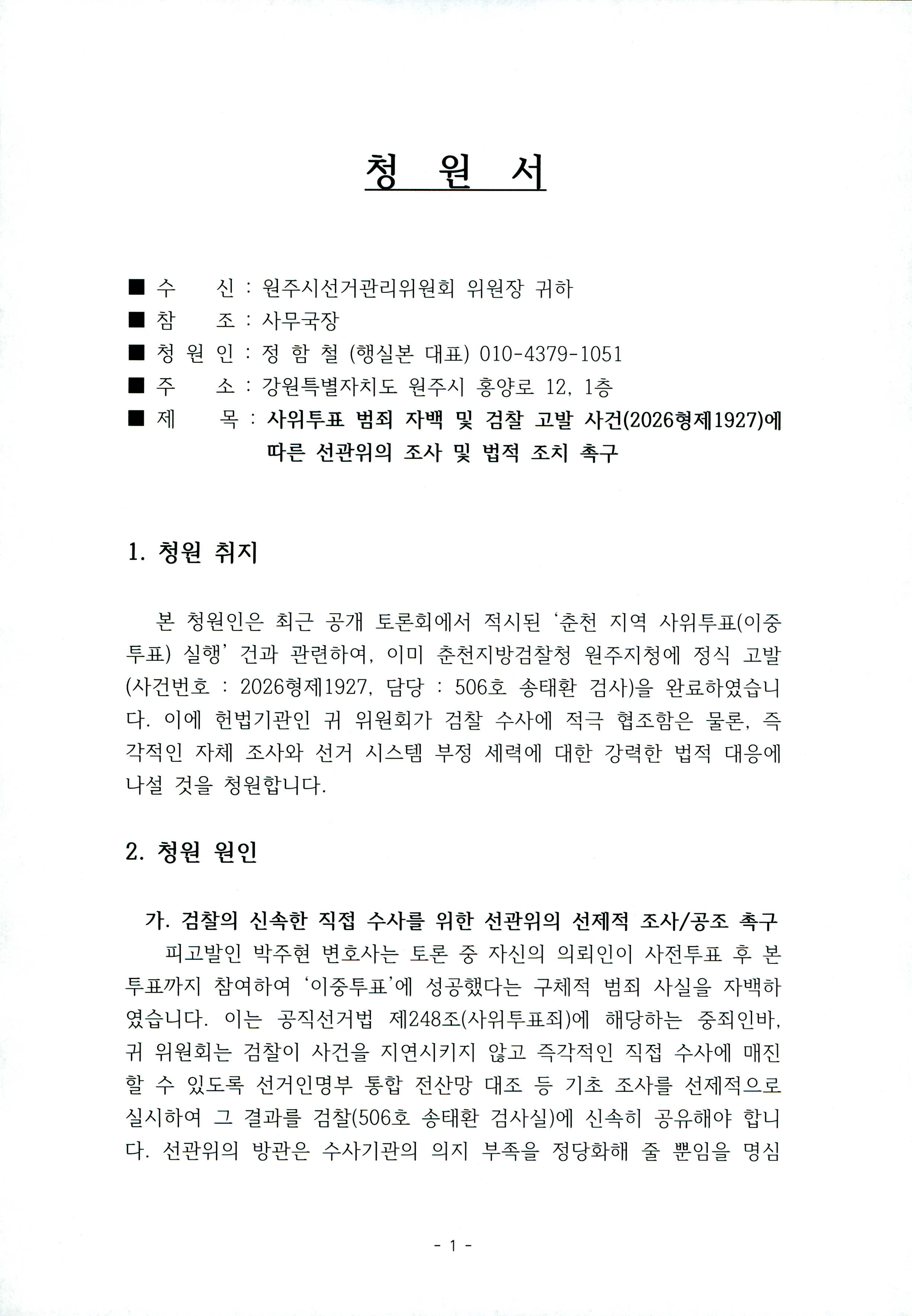 본 청원인은 최근 공개 토론회에서 적시된 ‘춘천 지역 사위투표(이중투표) 실행’ 건과 관련하여, 이미 춘천지방검찰청 원주지청에 정식 고발(사건번호 : 2026형제1927, 담당 : 506호 송태환 검사)을 완료하였습니다. 이에 헌법기관인 귀 위원회가 검찰 수사에 적극 협조함은 물론, 즉각적인 자체 조사와 선거 시스템 부정 세력에 대한 강력한 법적 대응에 나설 것을 청원합니다.