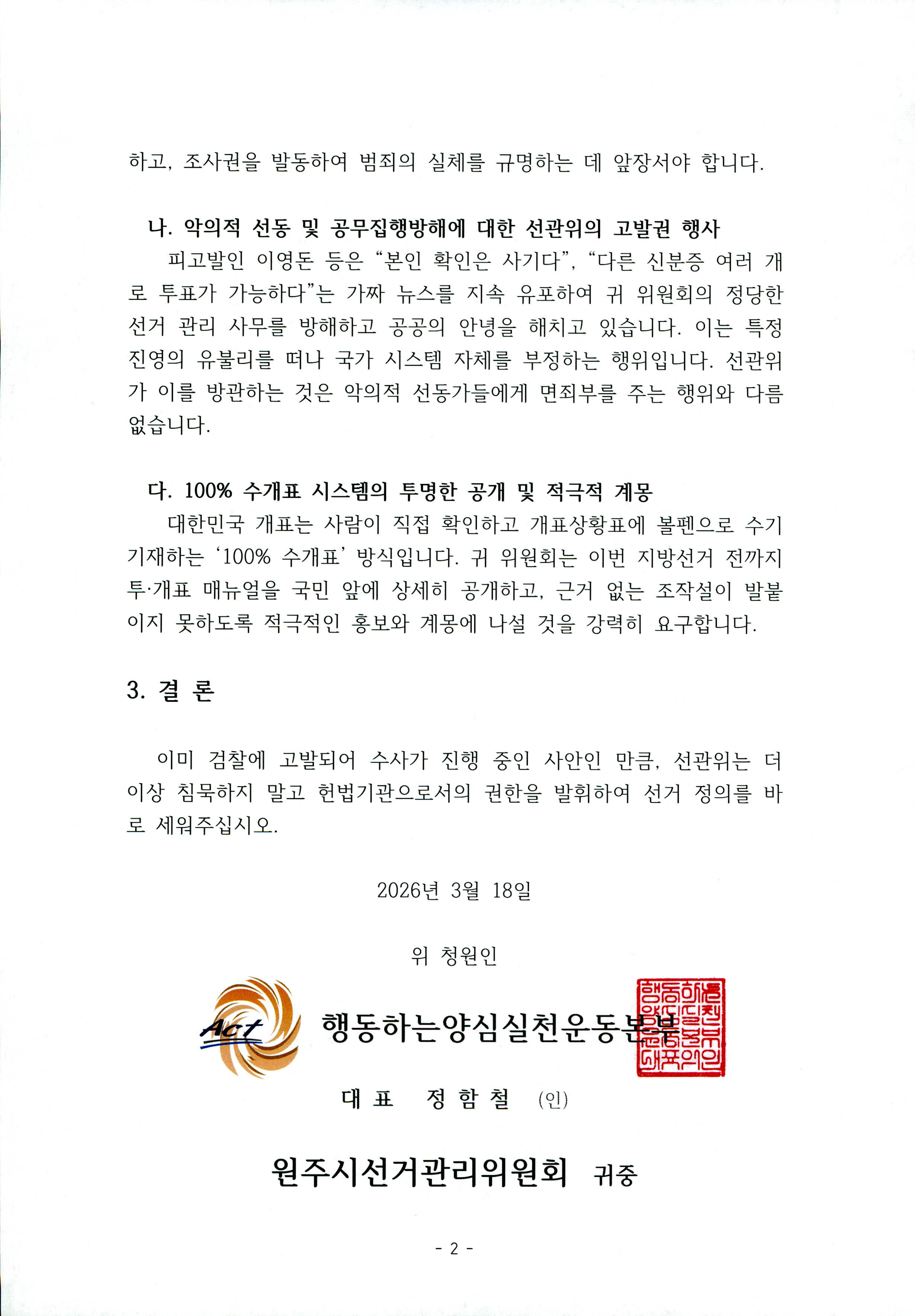 ■ 제 목 : 사위투표 범죄 자백 및 검찰 고발 사건(2026형제1927)에 따른 선관위의 조사 및 법적 조치 촉구