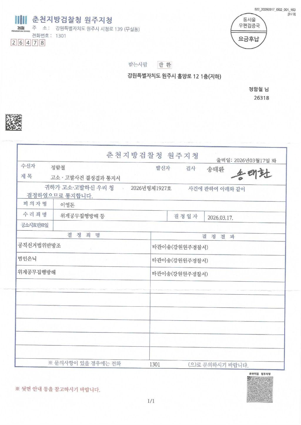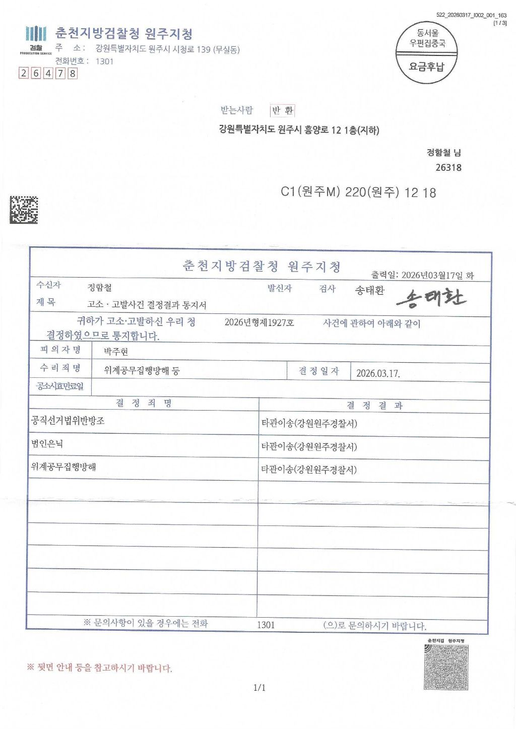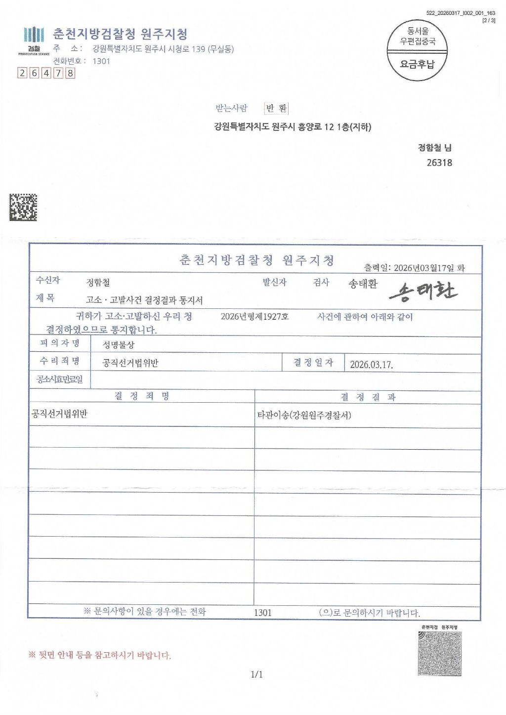 춘천지방검찰청 원주지청 송태환 검사가 수사할 수 있는 공직선거사범 고발사건조차 스스로 수사권을 포기하고 원주경찰서에 사건을 떠넘겼네요~