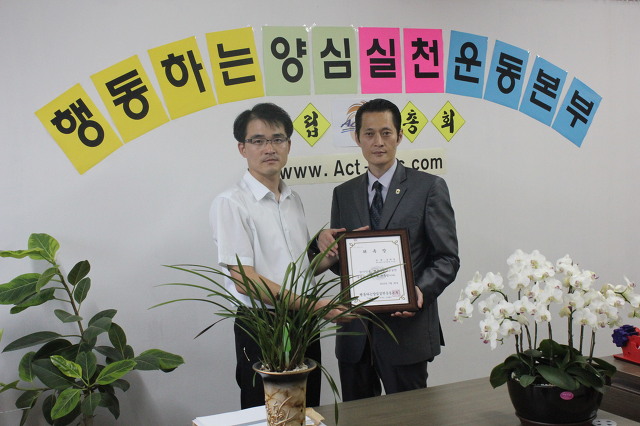 심원일 총재는 작년 10월 15일 공식 출범한 "행동하는양심실천운동본부(이하 행실본)"에 직간접적으로 많은 지원을 아끼지 않았으며, 금년 7월 6일 개소한 본부 사무실의 기본 집기류를 비롯한 물심양면으로 도움을 주셨습니다.