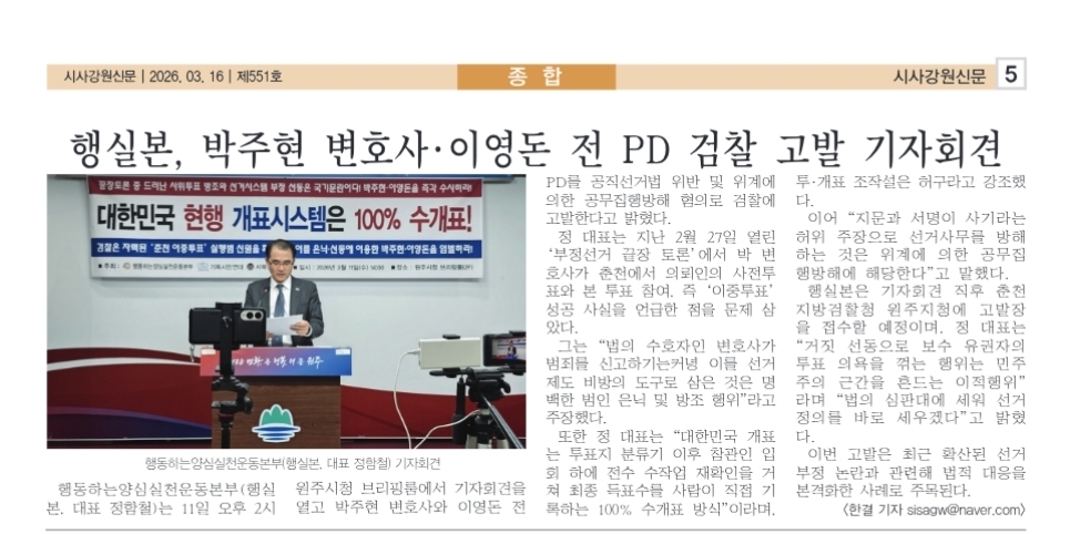 행실본은 기자회견 직후 춘천지방검찰청 원주지청에 고발장을 접수할 예정이며, 정 대표는 “거짓 선동으로 보수 유권자의 투표 의욕을 꺾는 행위는 민주주의 근간을 흔드는 이적행위”라며 “법의 심판대에 세워 선거 정의를 바로 세우겠다”고 밝혔다.