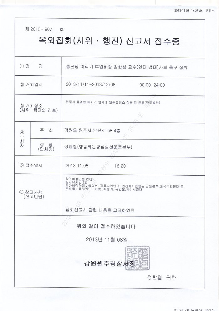 오늘 정식으로 집회신고를 마쳤고, 다음 주 부터는 본격적인 매국노 김한성 교수의 대학교수직 퇴출을 위해 애국주의연대와 함께 나설 것입니다.