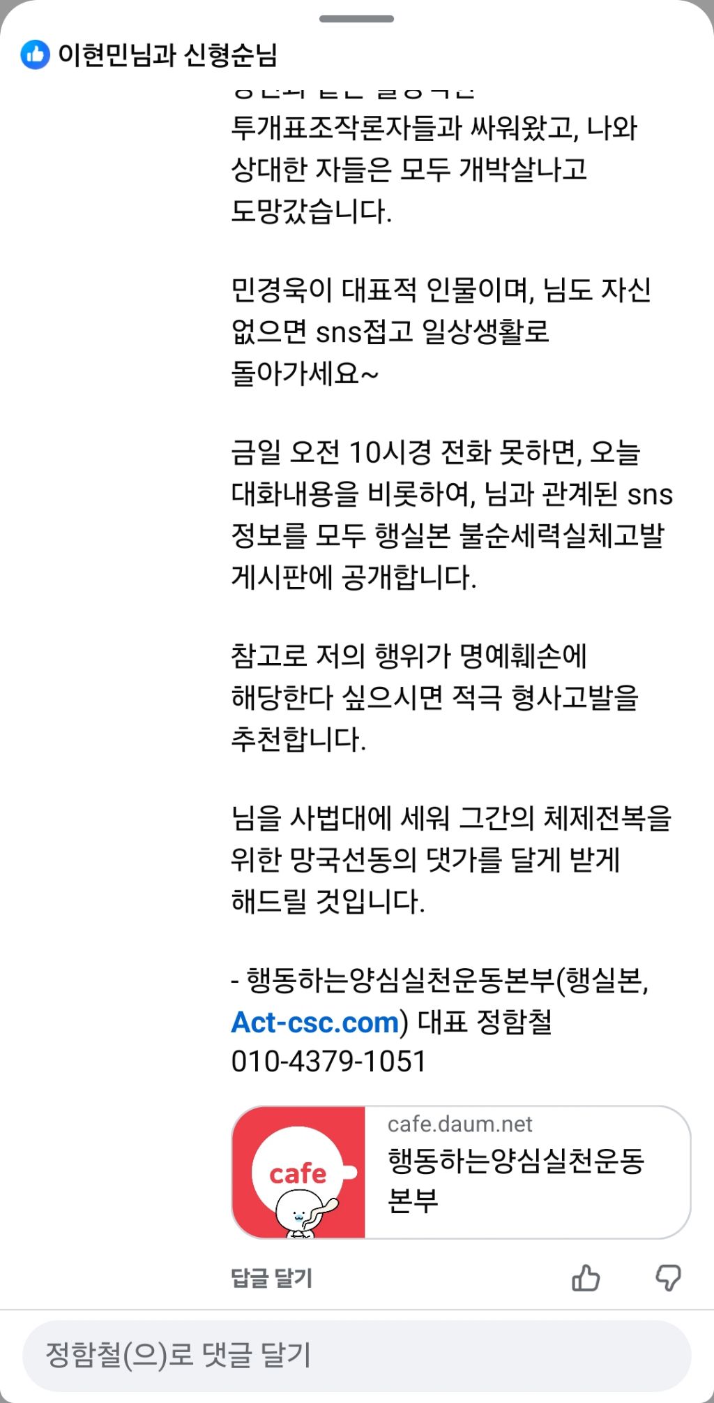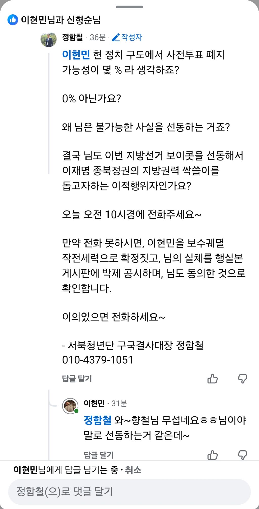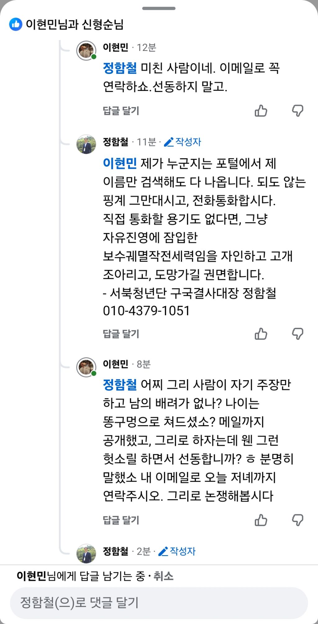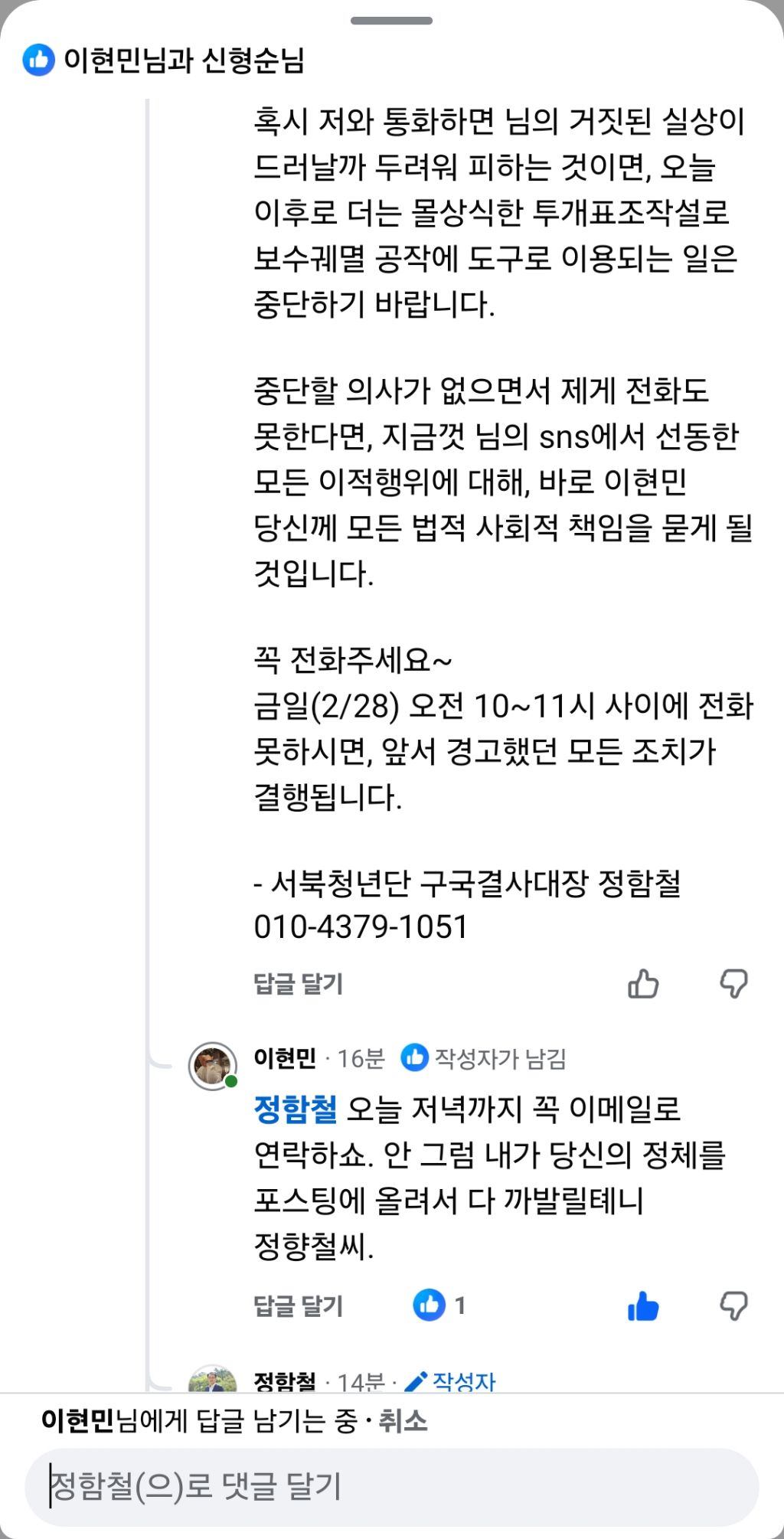 페이스북에서 활약 중인 보수궤멸작전세력 이현민 작성자정함철(요나답)|작성시간26.02.28|조회수139 목록 댓글 0 글자크기 작게가 글자크기 크게가 다음검색 현재 게시글 추가 기능 열기 북마크 공유하기 신고 센터로 신고 댓글 댓글 0 댓글쓰기 답글쓰기 댓글 리스트