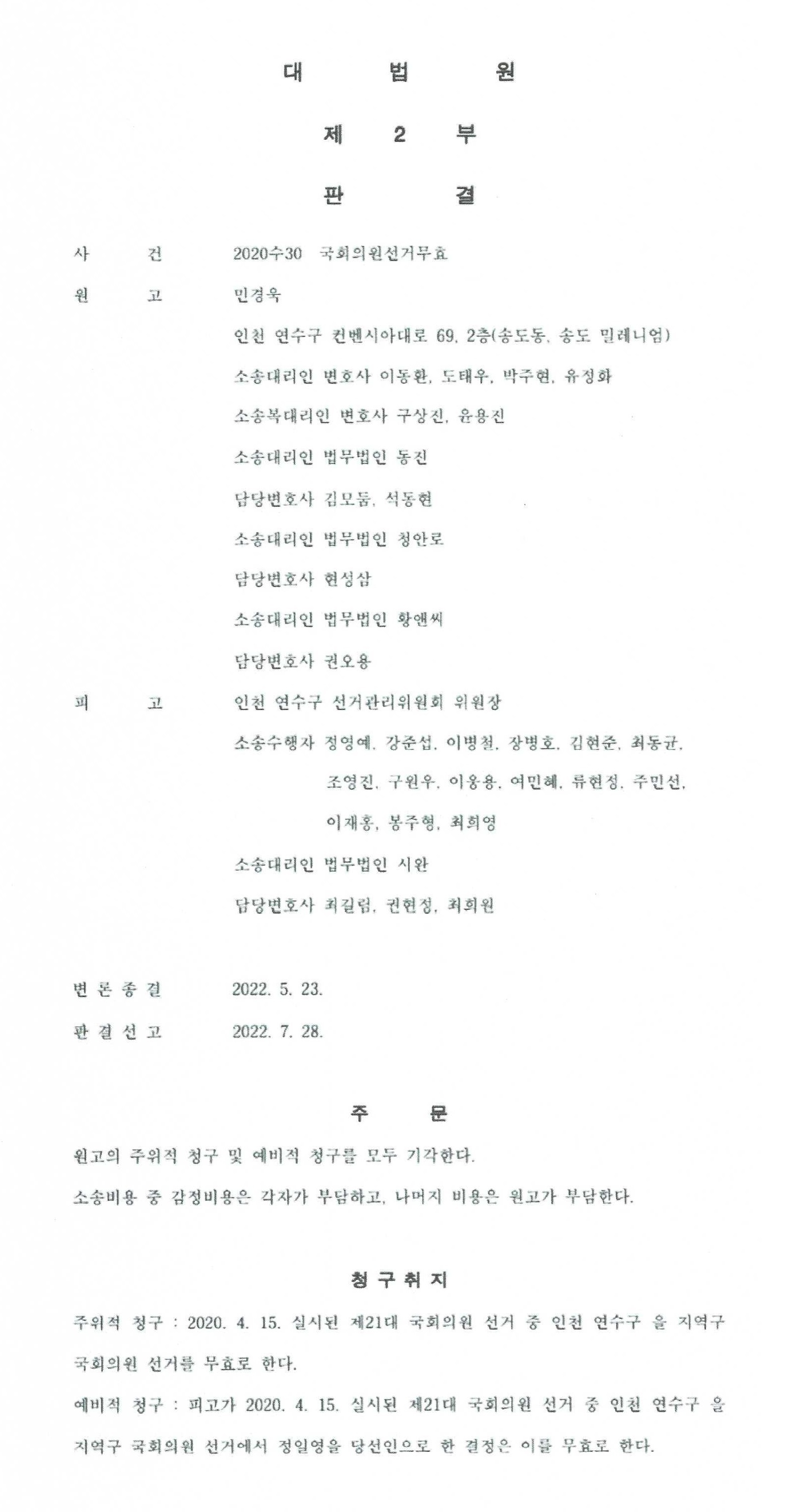 주위적 청구 : 2020. 4. 15. 실시된 제21대 국회의원 선거 중 인천 연수구 을 지역구 국회의원 선거를 무효로 한다.