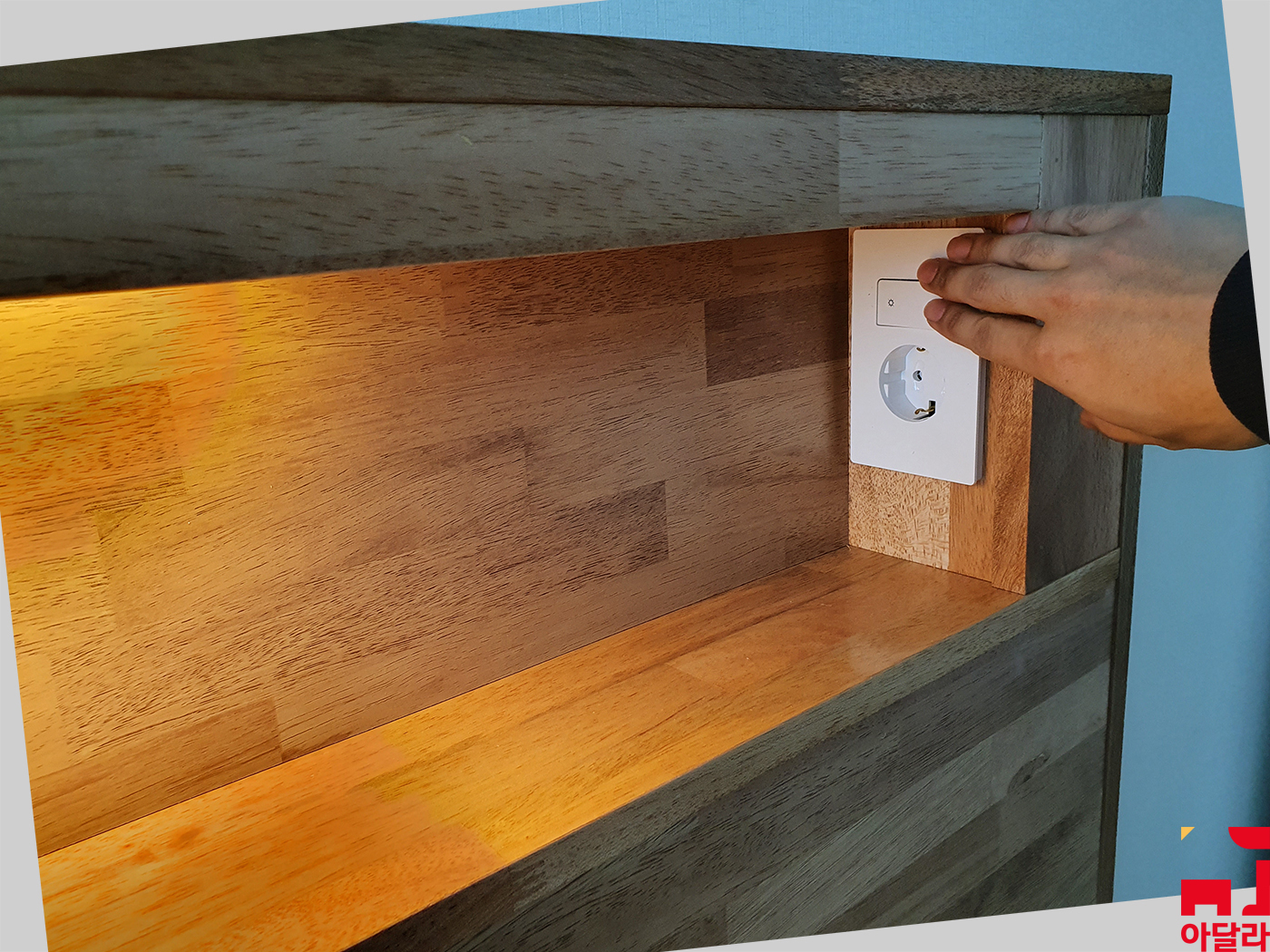 무케 서랍형 수납침대 헤드에는 전구색 LED 조명 옵션이 설치 돼 있어요.