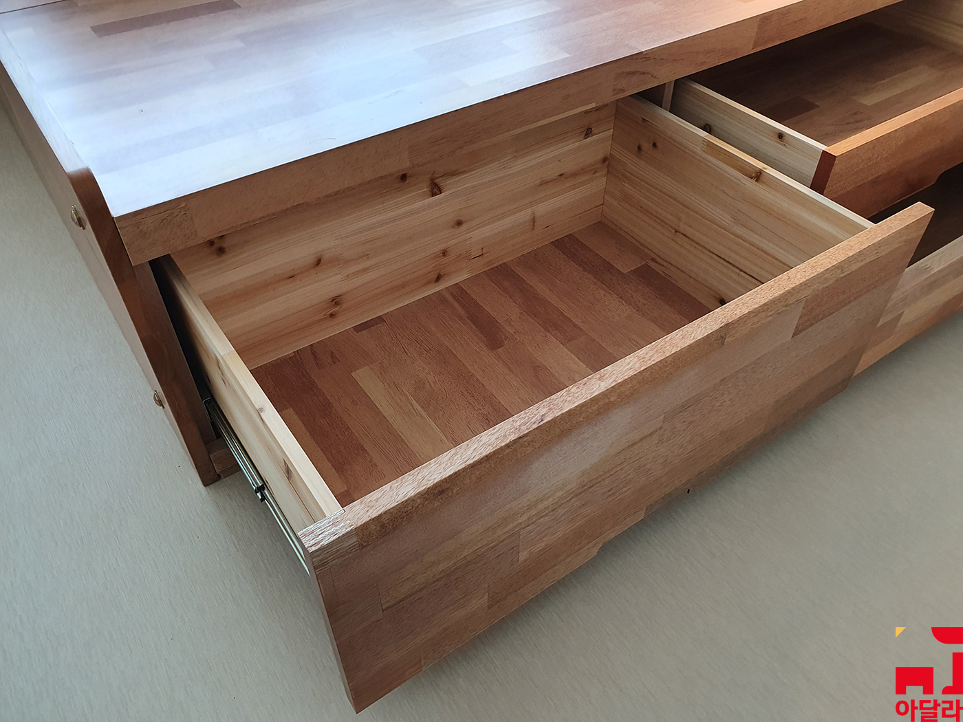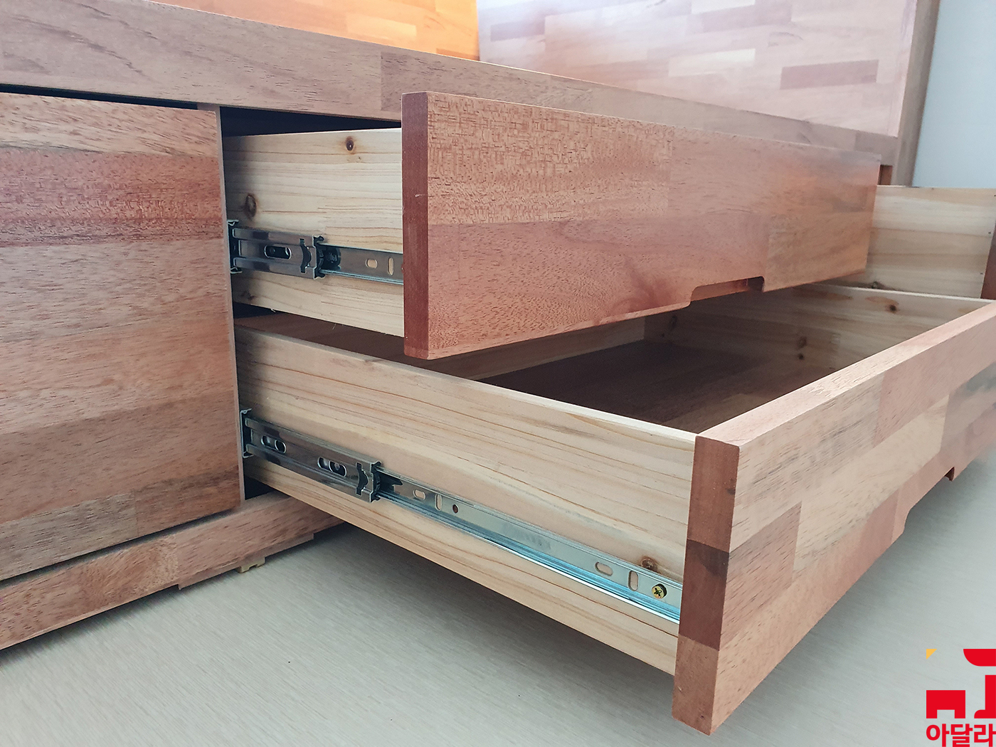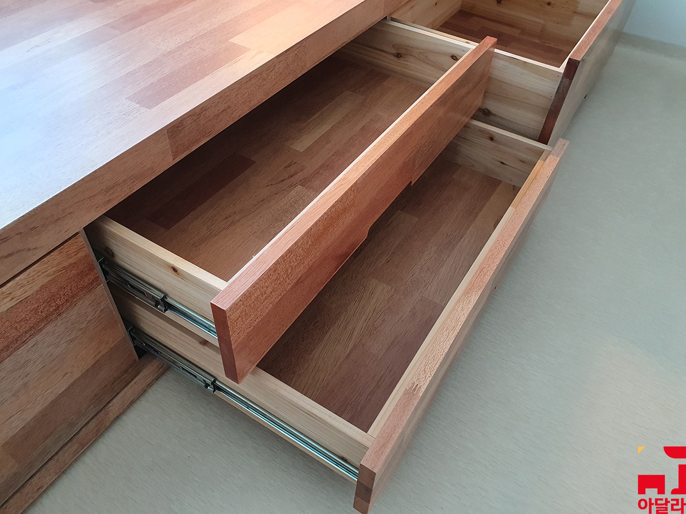 아달라는 서랍 레일을 바닥에서 약 2-3cm 띄워서 설치했기 때문에 물건이 무게를 안정적으로 지탱해주고 있어요. 그리고 서랍을 열고 닫을 때에도 부드럽게 사용할 수 있고요. 서랍 손잡이가 문짝 밑에 있는데 레일까지 밑에 있으면 서랍을 열고 닫을 때 불편함을 느끼게 됩니다.