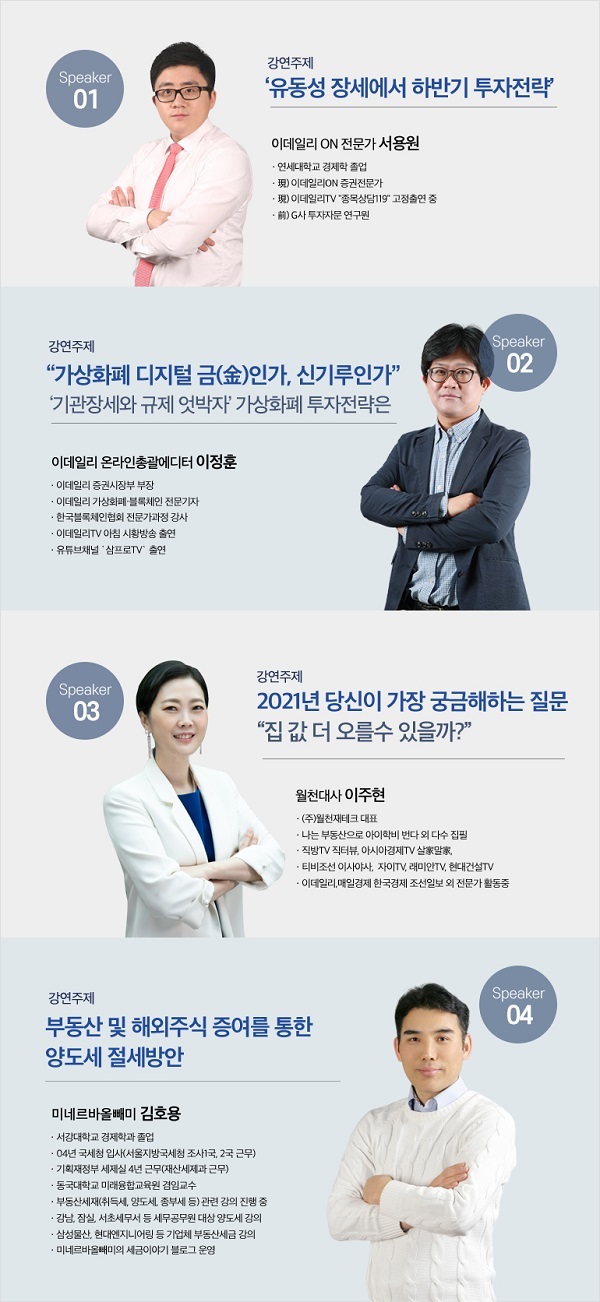 | [국내주식] 유동성 장세에서 하반기 투자전략 | [암호화폐/코인] "가상화폐 디지털금(金) 인가, 신기루인가" '기관장세와 규제 엇박자' 가상화폐 투자전략은 | [부동산] 2021년 당신이 가장 궁금해하는 질문 "집 값 더 오를 수 있을까?" | [세금/절세] 부동산 및 해외주식 증여를 통한 양도세 절세방안 |
