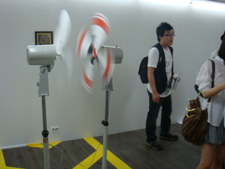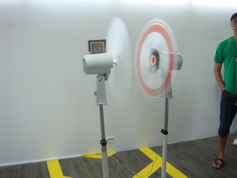 일정시간 서로 돌고 있는 선풍기, 좌회전 금지 표시가 날개에 그려져 있다