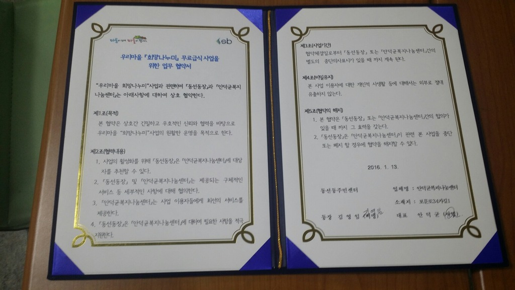 [부분안내]안덕균복지나눔센터 2015년 1월 13일 동선동 주민센터 안덕균복지나눔센터 협약식 작성자안덕균(낮은울타리)|작성시간16.01.17|조회수17 목록 댓글 0 글자크기 작게가 글자크기 크게가 우리마을 희망나누미 무료급식을 위한 협약식동선동주민센터 안덕균복지나눔센터2016년 1월 13일 동선동주민센터 동장님이 오셔서 협약식을 마쳤습니다협조 하에 앞으로 보다 나은 무료급식이 되기를 바랍니다우리마을 어려우신분들은 우리손으로^~^ 다음검색 현재 게시글 추가 기능 열기 북마크 공유하기 신고 센터로 신고 댓글 댓글 0 댓글쓰기 답글쓰기 댓글 리스트