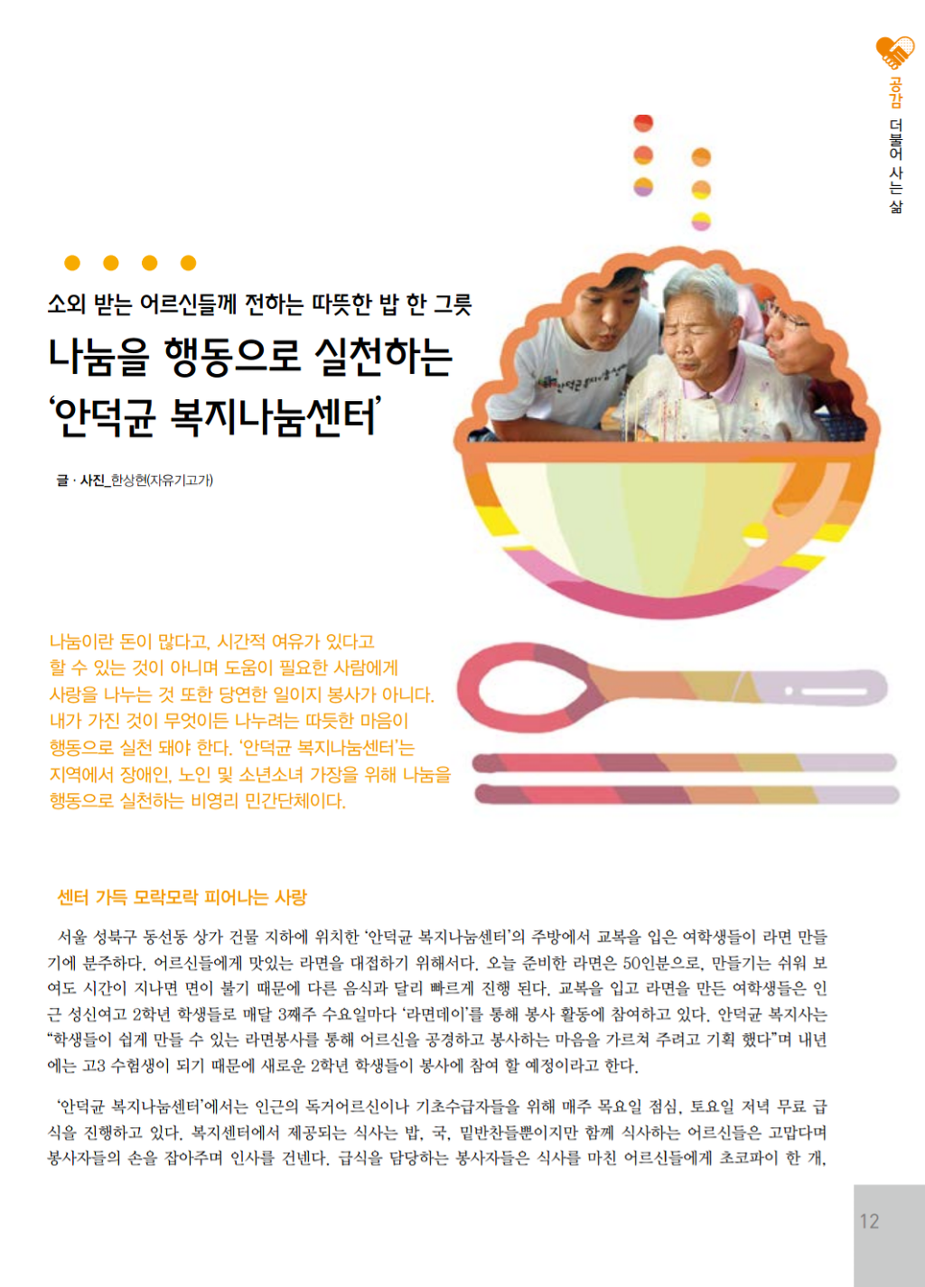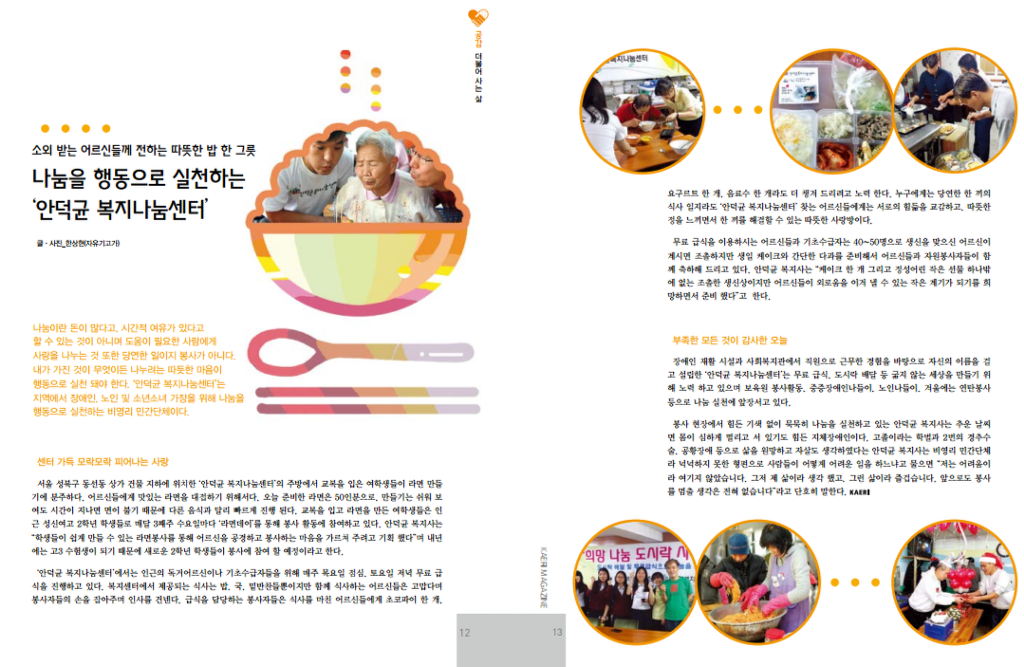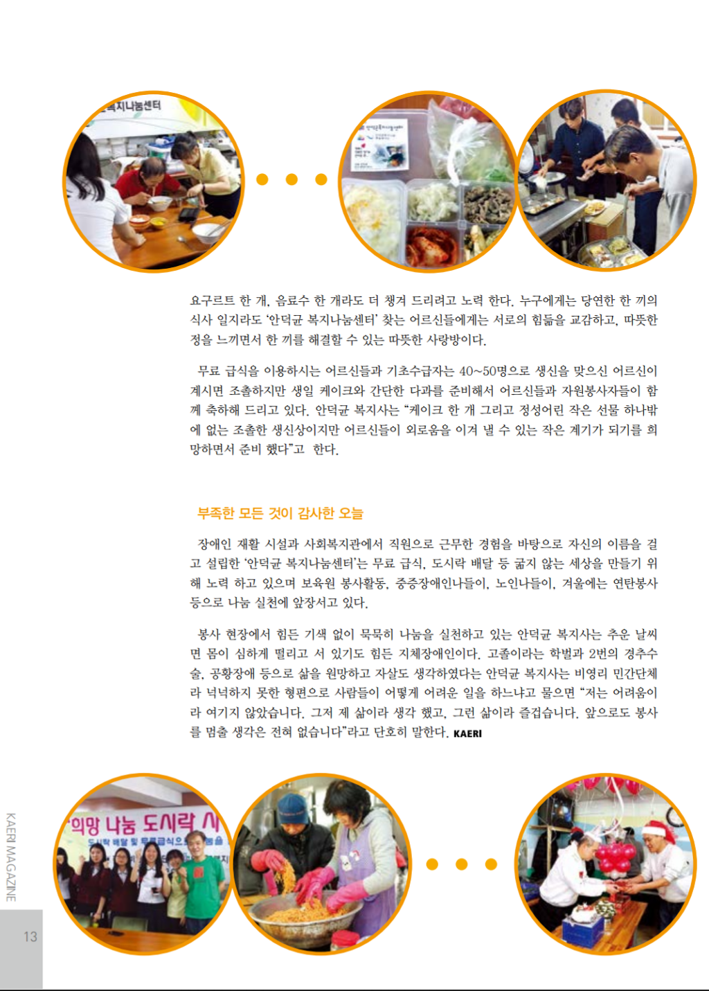 [전체공지사항]안덕균복지나눔센터 2016년 1월 한국원자력연구원 원우 사보에 나눔이야기 게재 작성자안덕균(낮은울타리)|작성시간16.01.26|조회수29 목록 댓글 0 글자크기 작게가 글자크기 크게가 한국원자력연구원 "원우" 2016년 첫시작을 알리는 사보월간이 나왔습니다 안덕균복지나눔센터 이야기가 게재되었습니다나눔의 이야기가 많은분들에게 전달되어 많은이들이 자기 지역에서 나눔이 더욱 많이 전파되기를 바랍니다 다음검색 현재 게시글 추가 기능 열기 북마크 공유하기 신고 센터로 신고 댓글 댓글 0 댓글쓰기 답글쓰기 댓글 리스트