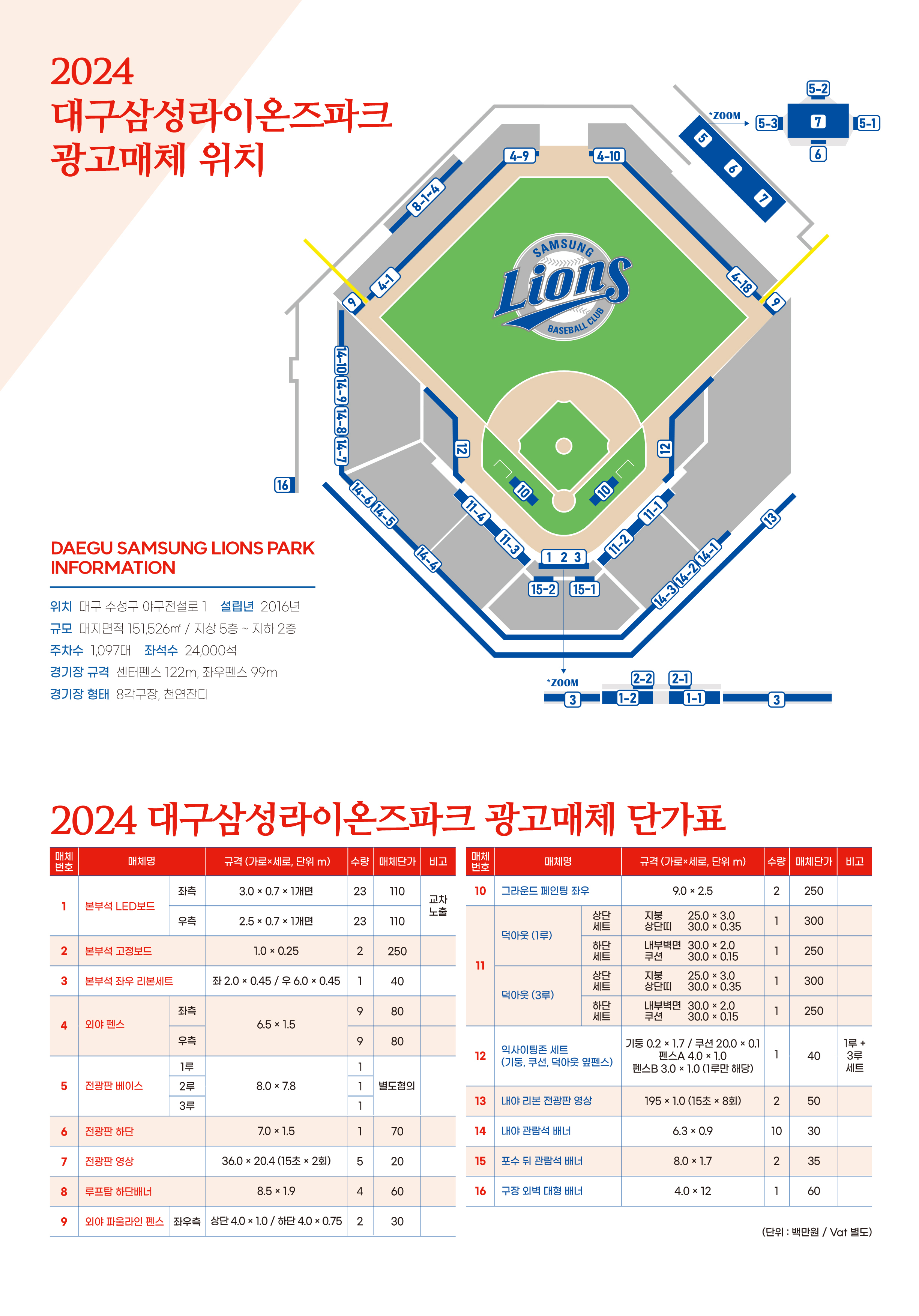 대구 삼성라이온즈파크 광고매체 위치 및 단가표