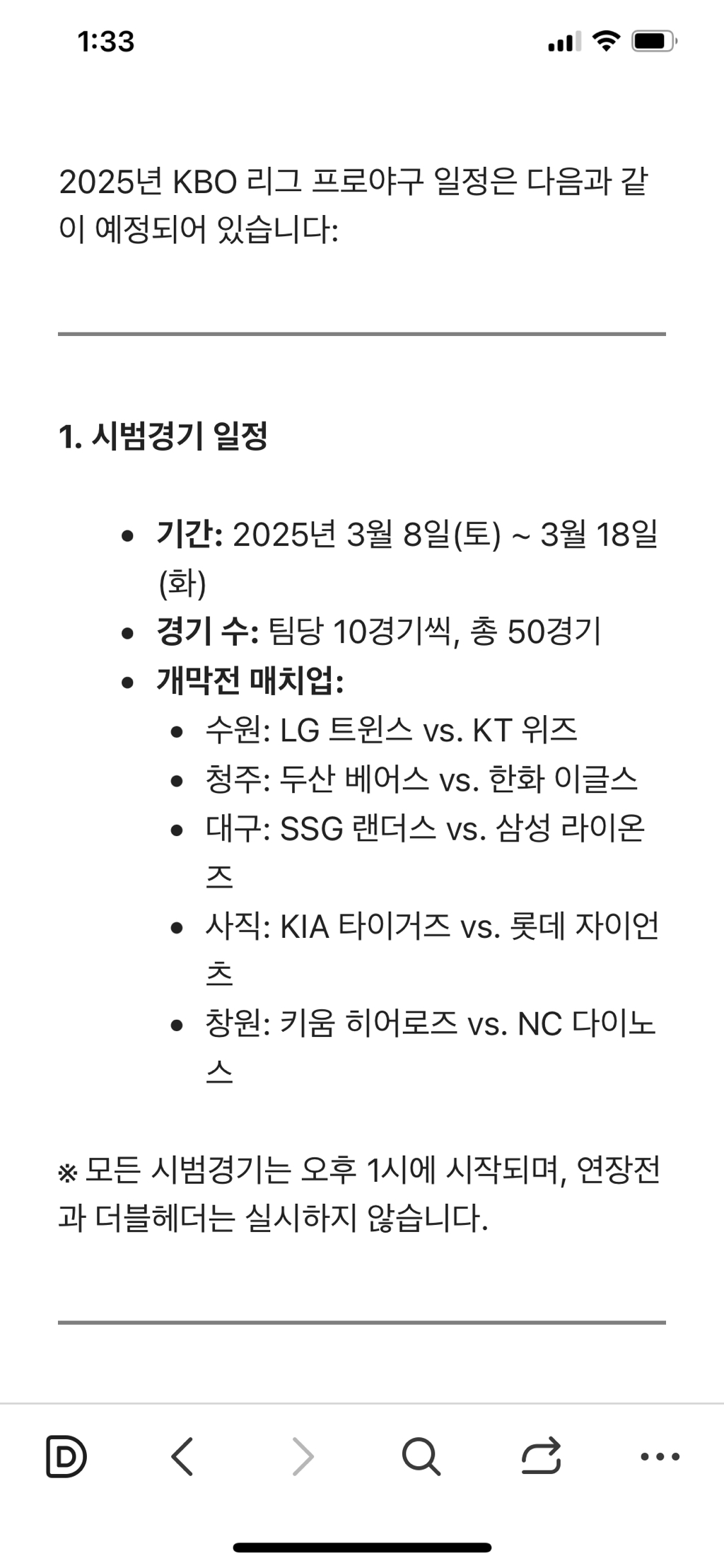 시범경기는 3월 8일(토)부터 3월 18일(화)까지 진행되며, 각 팀당 10경기씩 총 50경기가 치러질 예정입니다.
