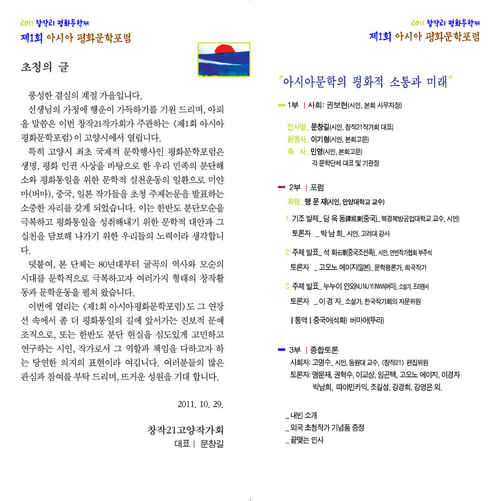 제1회 아시아평화문학포럼에 초청합니다. 작성자민들레|작성시간11.10.14|조회수16 목록 댓글 0 글자크기 작게가 글자크기 크게가 다음검색 현재 게시글 추가 기능 열기 북마크 공유하기 신고 센터로 신고 댓글 댓글 0 댓글쓰기 답글쓰기 댓글 리스트
