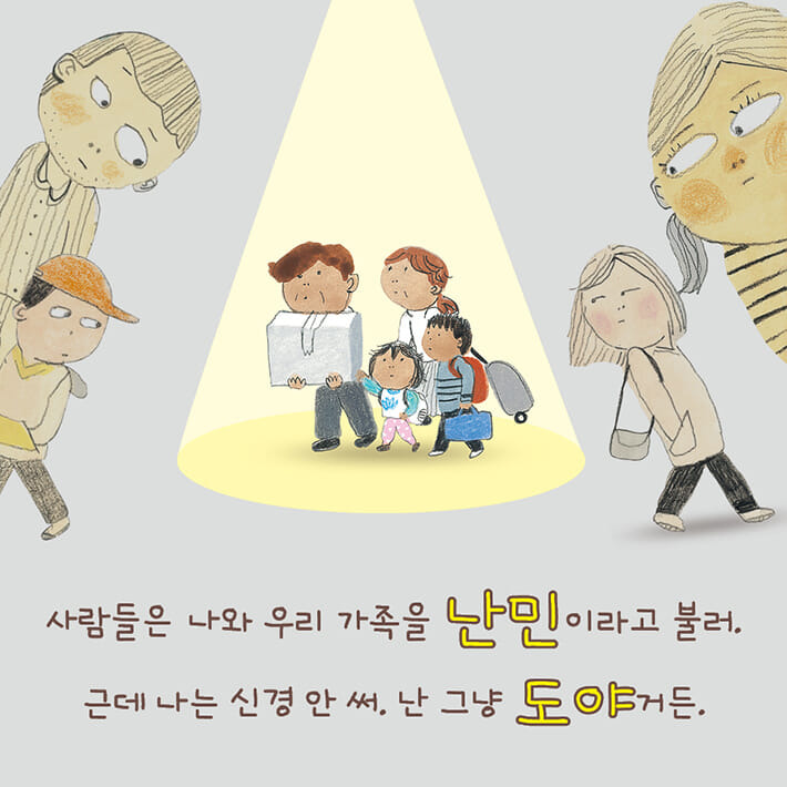 안선모 글/심윤정 그림 | 청어람주니어 | 2020년 10월 30일 카드뉴스로 보는 책 책소개 2020 경기도 우수출판물 제작지원 선정작 1위 작품 “난민도 싫고 정착민도 싫어. 난 그냥 도야야!” 도야의 좌충우돌 한국 적응기 새봄초등학교 2학년 2반 김도영은 난민입니다. 한국 이름은 김도영이지만, 진짜 이름인 도야를 더 좋아하지요. 도야는 1년 전 엄마, 아빠, 오빠 에티카랑 함께 한국으로 왔습니다. 사람들은 도야네 가족을 보고 난민이라고 대놓고 손가락질도 했습니다. 도야는 사람들에게 이렇게 말합니다. “난민도 싫고 정착민도 싫어. 난 그냥 도야야!” 꼬마 난민 도야의 일상을 생생하게 담은 저학년 동화입니다. 낯선 나라 한국에 익숙하지 않아 서툰 면모도 있지만 주눅 들지 않는 도야의 당당한 모습이 돋보이는 작품입니다. 목차 나, 김도영 아니거든! 꼬마 난민 점심시간 받아쓰기 대박 사건 탬버린 모자 알쏭달쏭 안내장 처음 간 영화관 사라진 도야 떡국과 몽로예보 상세 이미지 저자 소개 (2명) |