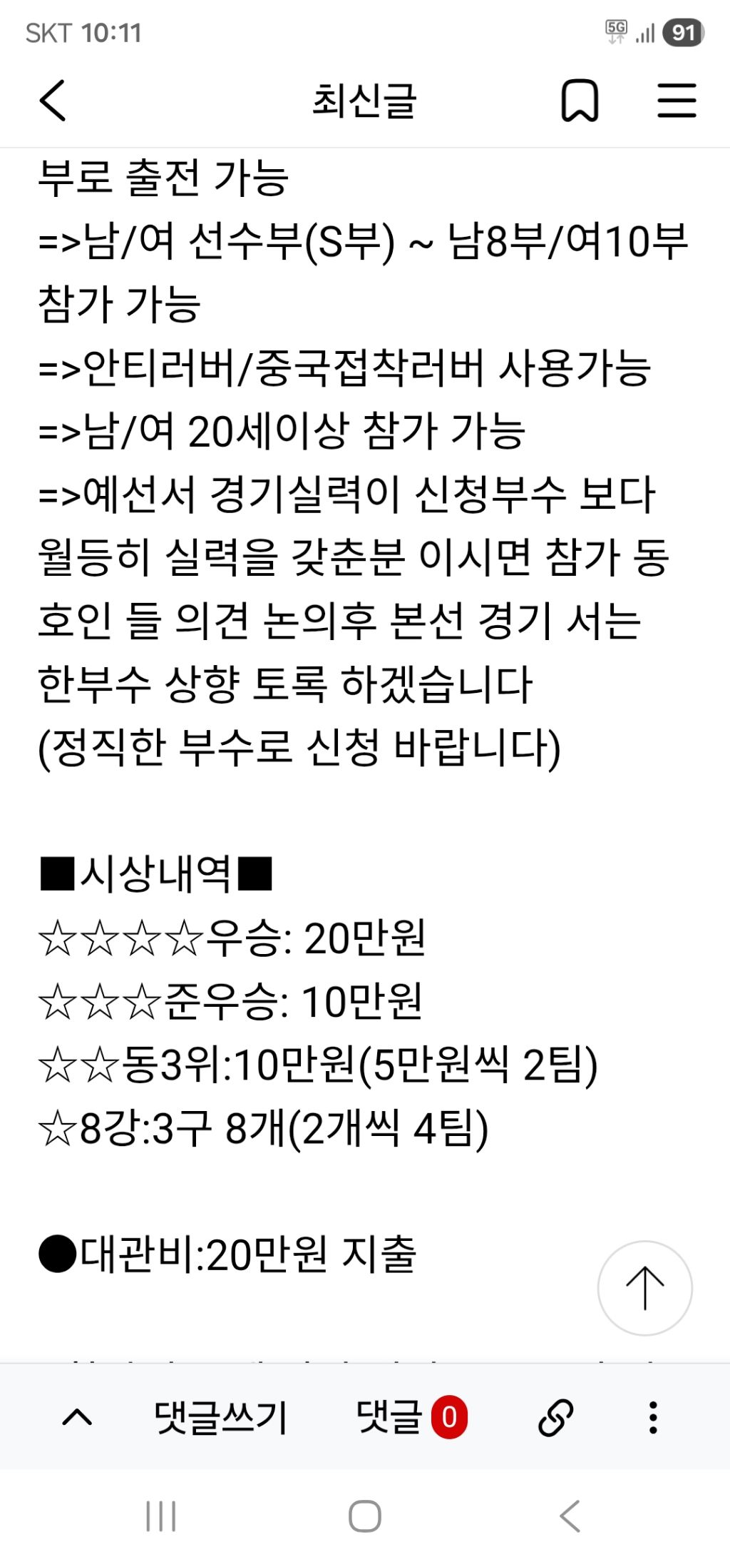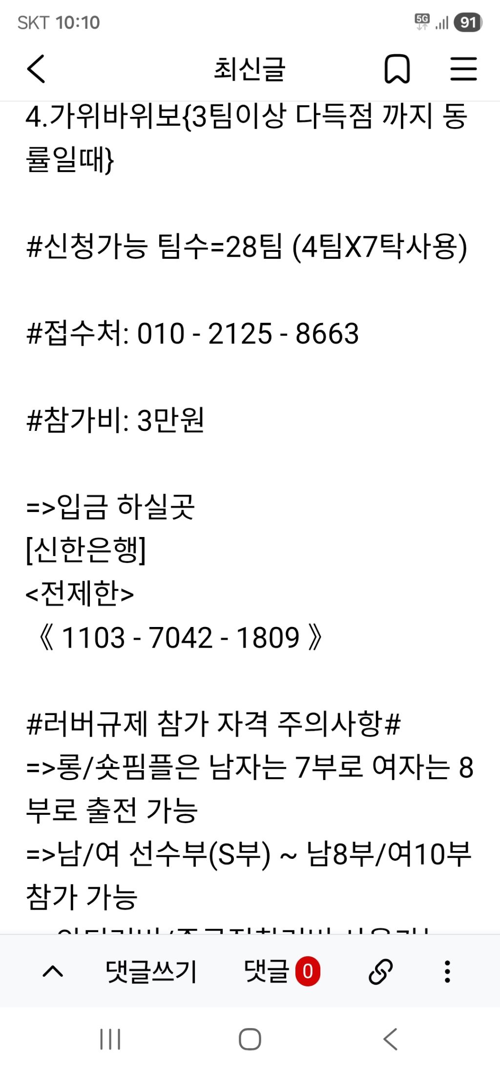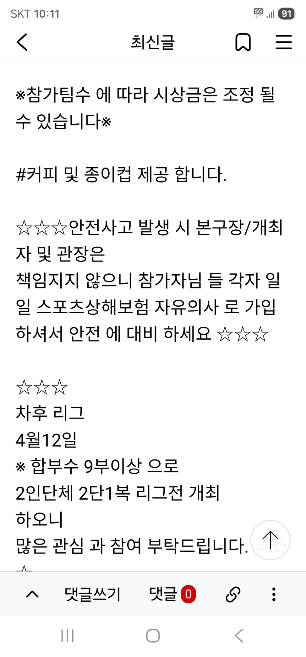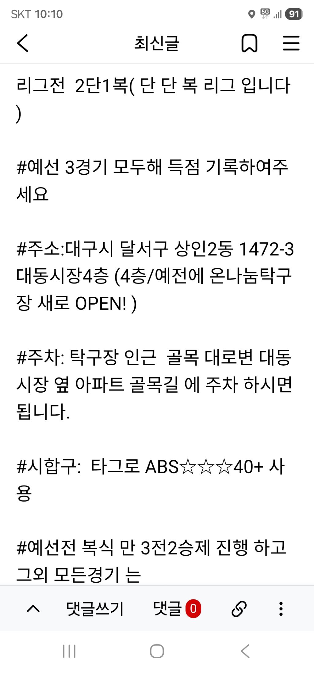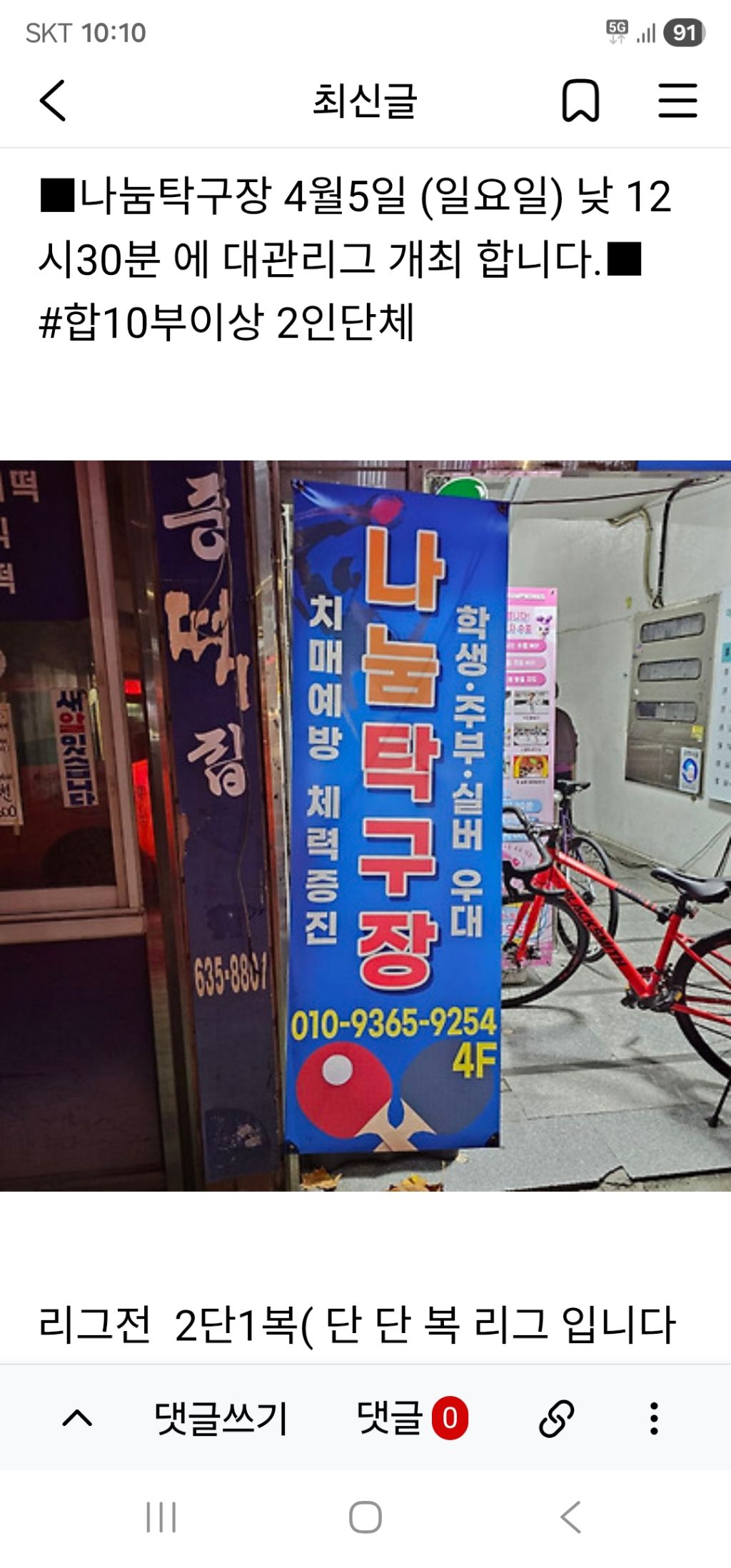 나눔탁구장 4월5일 12시30분 2인 2단1복 합10부이상 리그개최 작성자나인틴가이|작성시간26.04.04|조회수13 목록 댓글 0 글자크기 작게가 글자크기 크게가 다음검색 현재 게시글 추가 기능 열기 북마크 공유하기 신고 센터로 신고 댓글 댓글 0 댓글쓰기 답글쓰기 댓글 리스트
