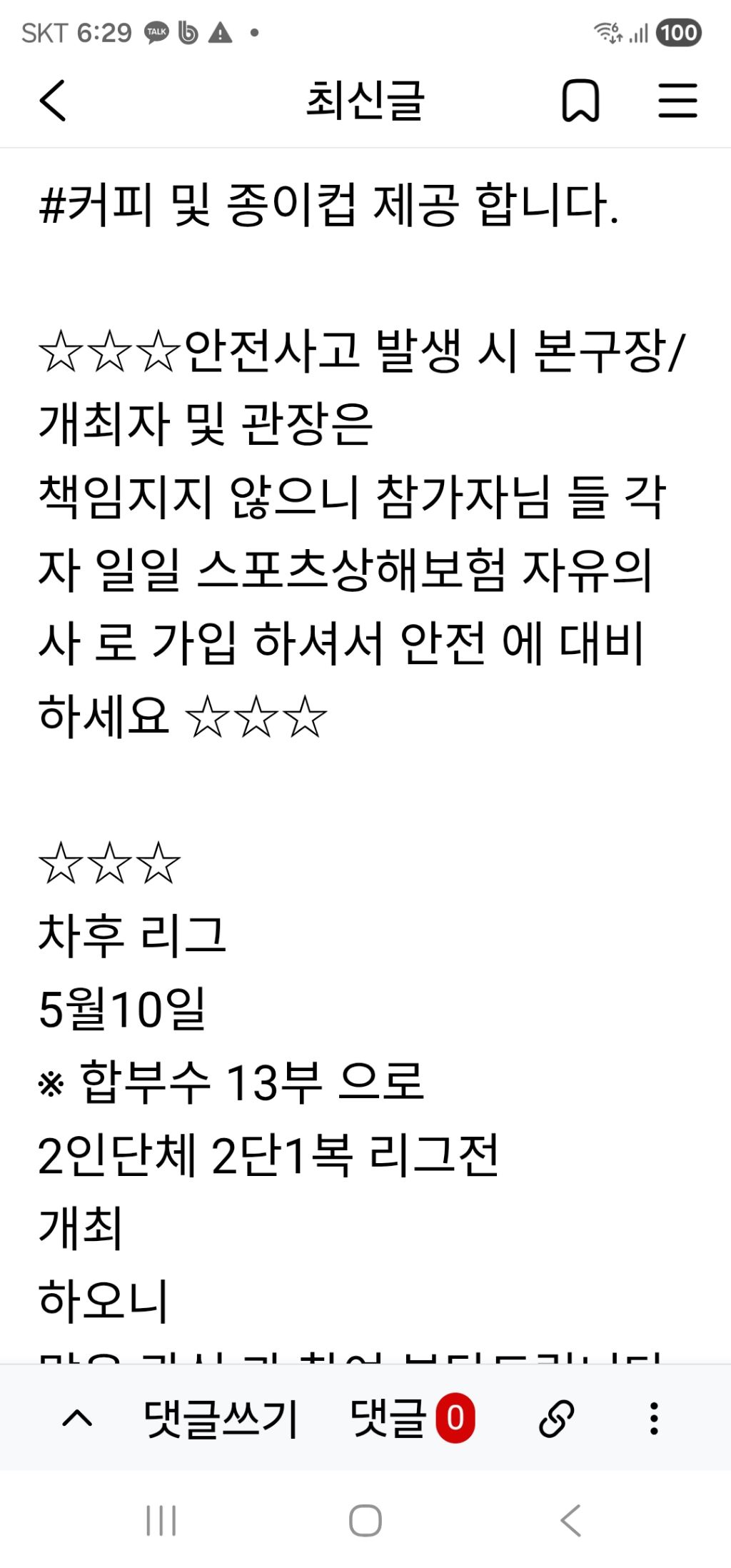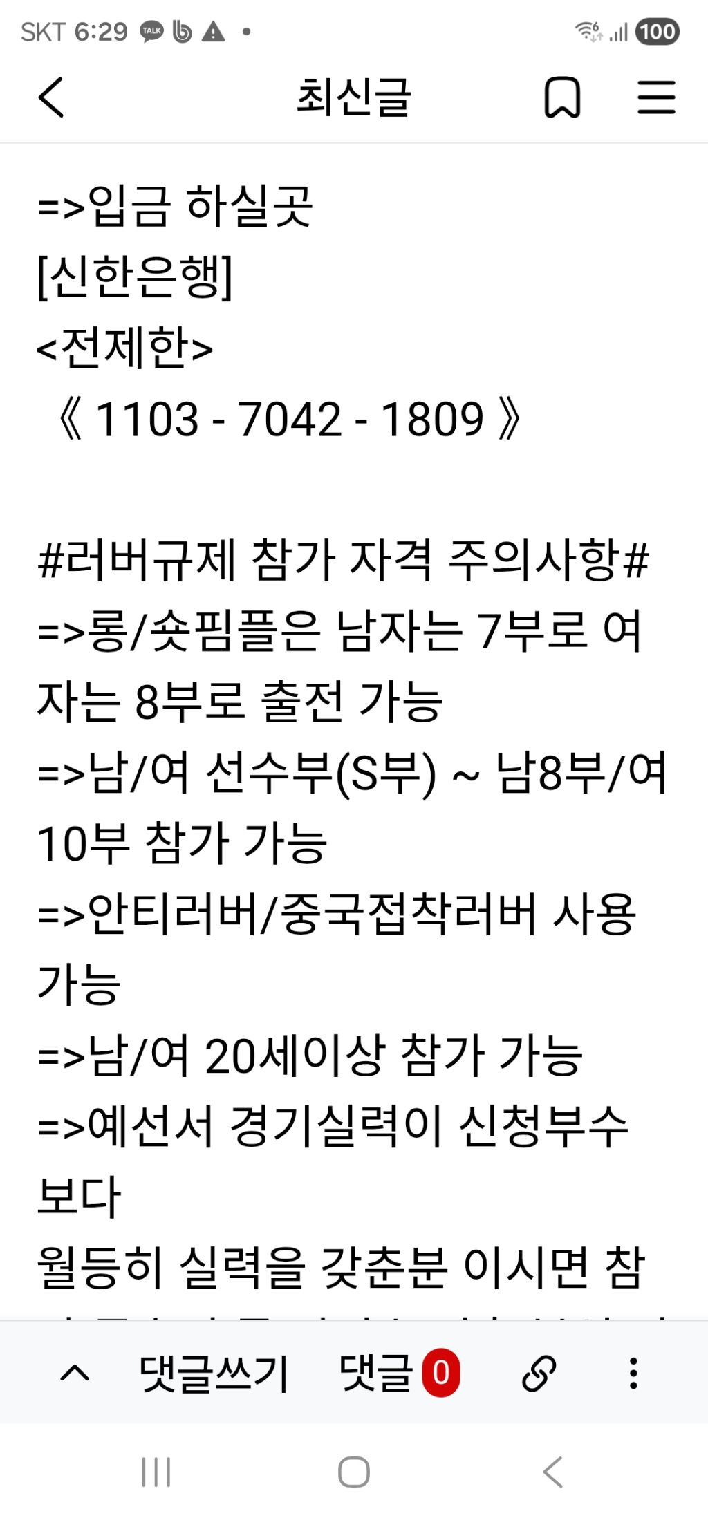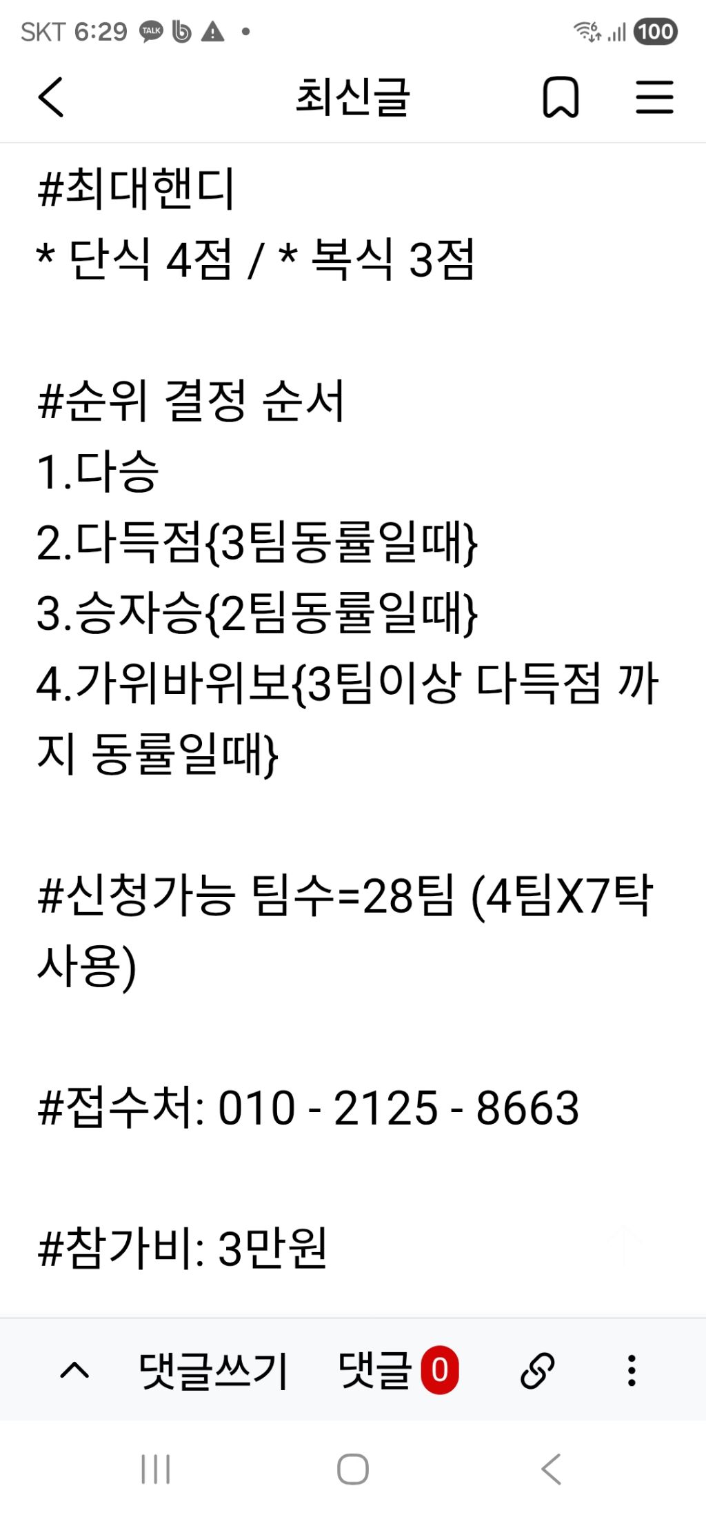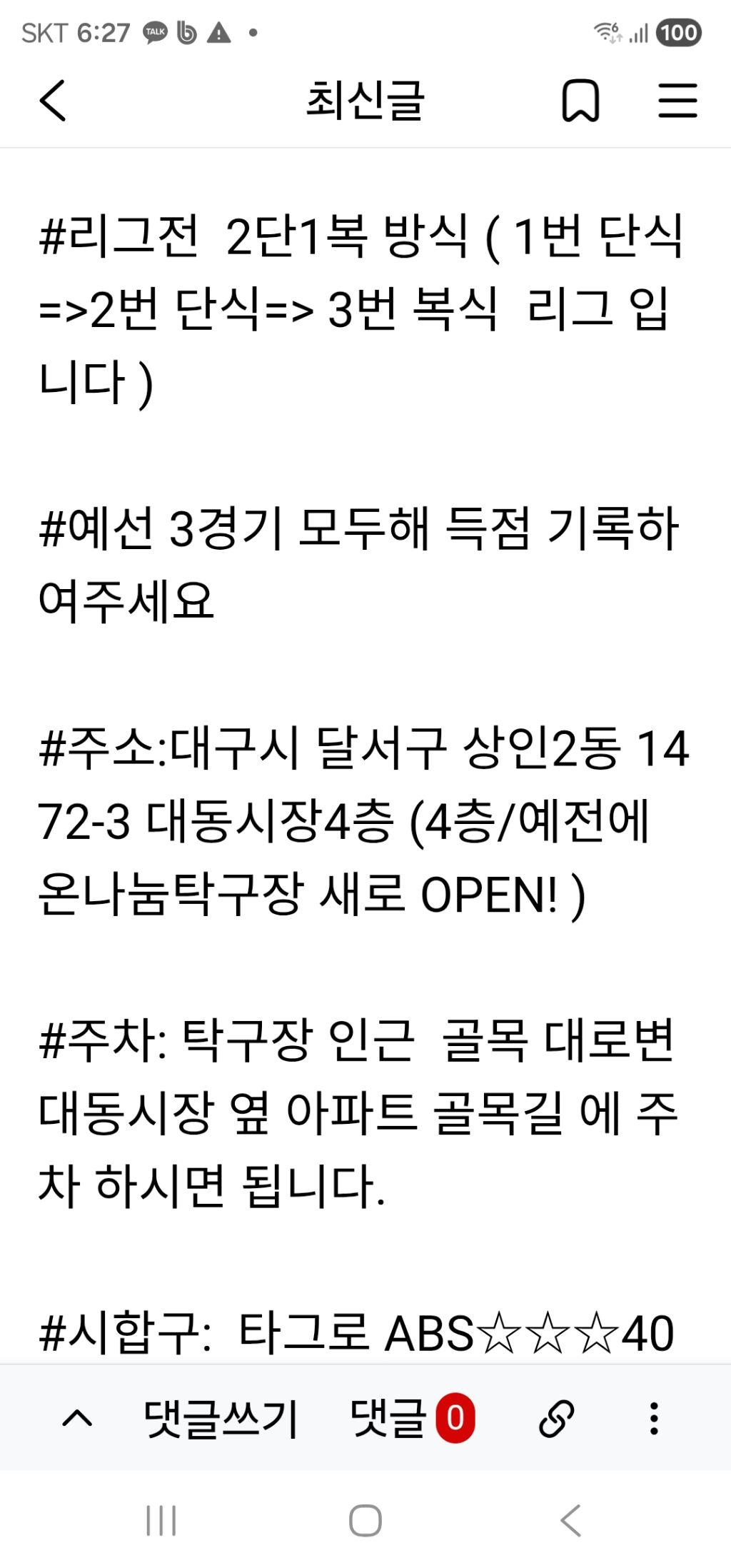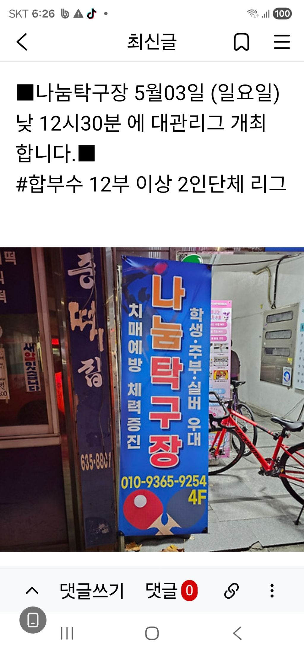 나눔탁구장 5월3일 12시30분 2인 2단1복리그 합12부이상 리그개최 작성자나인틴가이|작성시간26.04.23|조회수5 목록 댓글 0 글자크기 작게가 글자크기 크게가 다음검색 현재 게시글 추가 기능 열기 북마크 공유하기 신고 센터로 신고 댓글 댓글 0 댓글쓰기 답글쓰기 댓글 리스트