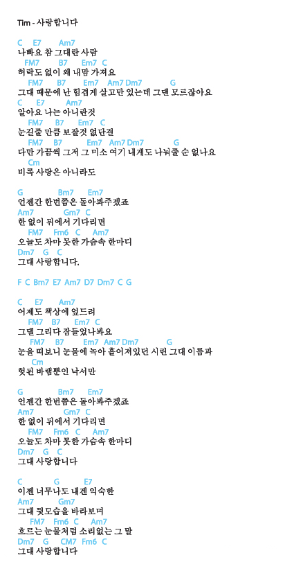 팀 '사랑합니다' 가사와 코드 작성자엠뮤직|작성시간16.08.17|조회수415 목록 댓글 0 글자크기 작게가 글자크기 크게가 다음검색 현재 게시글 추가 기능 열기 북마크 공유하기 신고 센터로 신고 댓글 댓글 0 댓글쓰기 답글쓰기 댓글 리스트