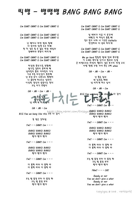빅뱅 '뱅뱅뱅' 가사와 코드 작성자엠뮤직|작성시간16.12.02|조회수149 목록 댓글 0 글자크기 작게가 글자크기 크게가 다음검색 현재 게시글 추가 기능 열기 북마크 공유하기 신고 센터로 신고 댓글 댓글 0 댓글쓰기 답글쓰기 댓글 리스트