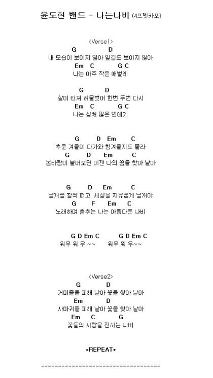 윤도현밴드 '나는 나비' 가사와 코드 작성자엠뮤직|작성시간17.02.06|조회수1,094 목록 댓글 0 글자크기 작게가 글자크기 크게가 다음검색 현재 게시글 추가 기능 열기 북마크 공유하기 신고 센터로 신고 댓글 댓글 0 댓글쓰기 답글쓰기 댓글 리스트