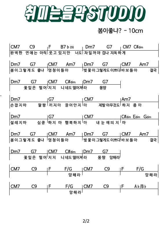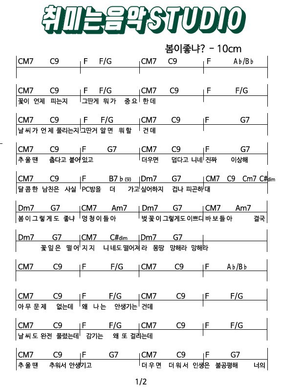 10cm '봄이 좋냐?' 가사와 코드 작성자엠뮤직|작성시간17.10.25|조회수1,545 목록 댓글 0 글자크기 작게가 글자크기 크게가 다음검색 현재 게시글 추가 기능 열기 북마크 공유하기 신고 센터로 신고 댓글 댓글 0 댓글쓰기 답글쓰기 댓글 리스트