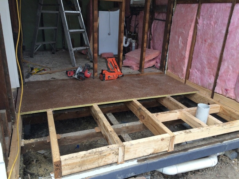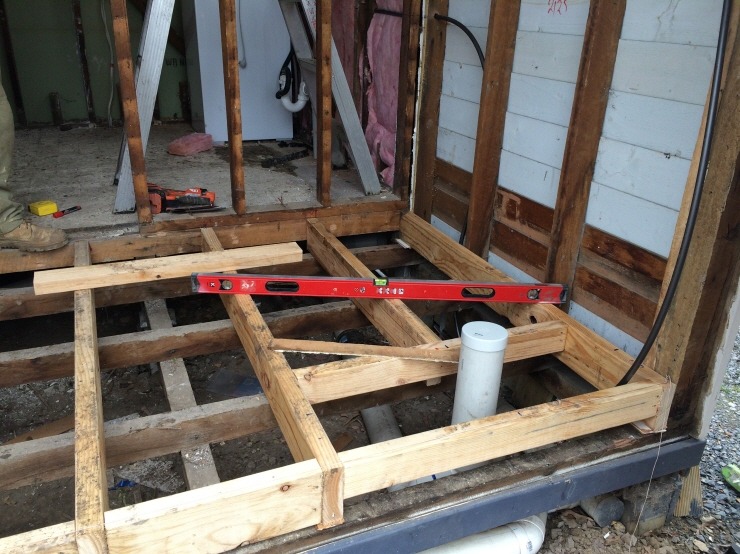 리노베이션의 진수인 바닥 수평맞추기와 벽채수직맞추기 입니다. 아시다시피 이놈의 벽채는 나무로 되어 있어 세월이 지나면 다 뒤틀리기 마련입니다. 또한 이런 웨더보드집인 경우 더욱 변형이 심해 마루바닥이 수평인 구석이 없으며 벽면이 수직인 곳이 없습니다. 따라서 기존의 바닥라인을 수평으로 만들수 없기 때문에 기존의 기울어진 바닥라인을 그대로 새로 구성하는 바닥면에 투사를 해서 맞춰야 타일을 할때 타일러가 뒷목잡고 쓰러지는 일을 막을 수 있습니다. 이런 이유로 핸디맨일은 개나소나 할 수 있지만 진짜 목수일은 경력이 말해 주는 것으로 아무나 금방따라할 수 있는 일이 아닙니다. ^^;;