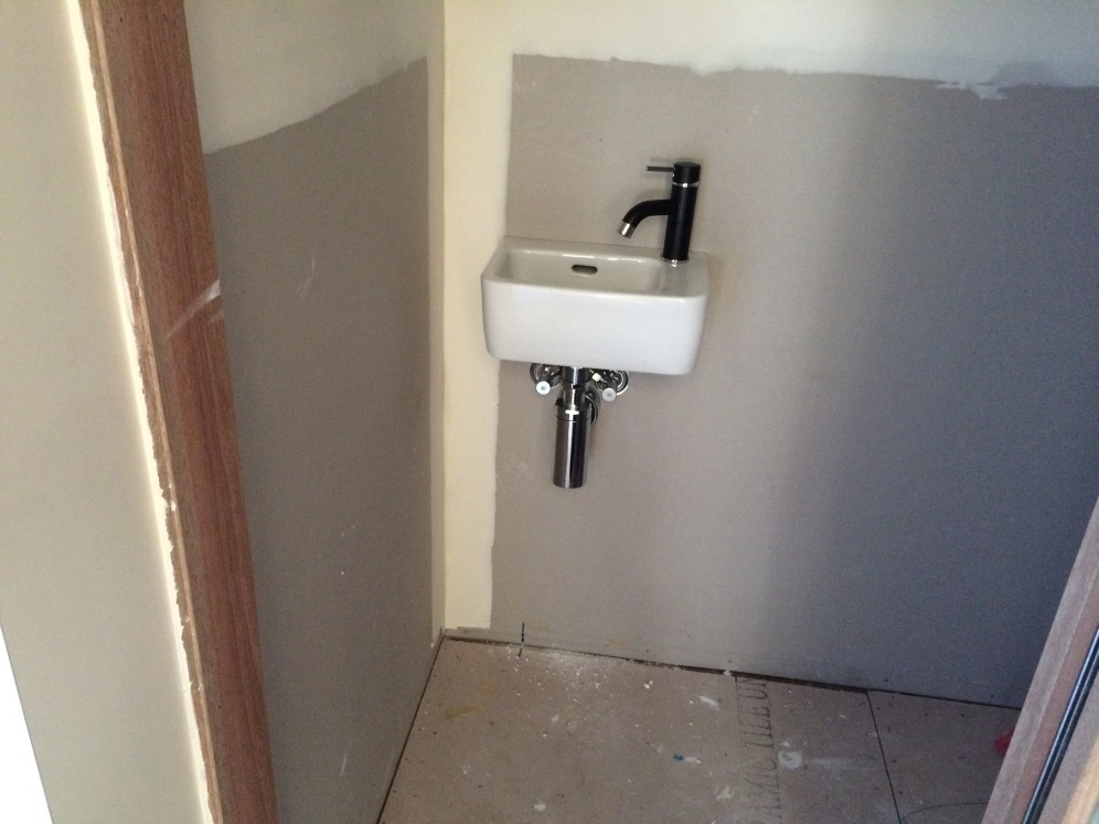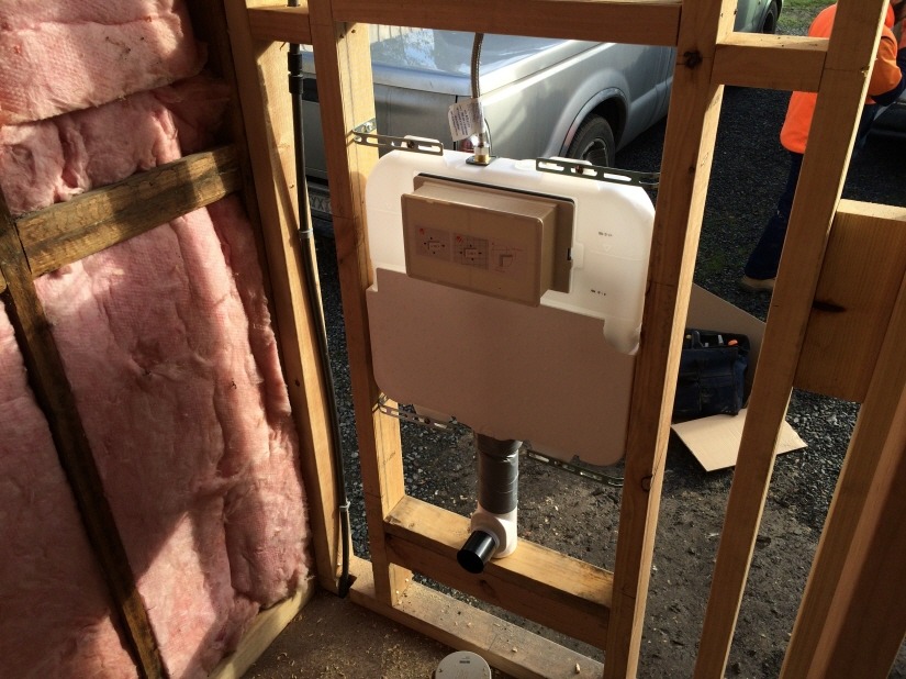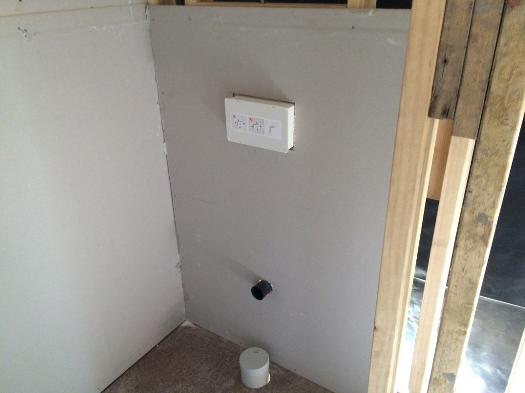 앞의 in-wall cistern을 설치후 플라스터를 덮은 모습입니다.
