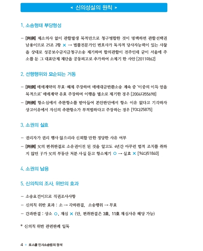 둘째, 최신 판례가 아니더라도 2021 민사재판실무 교재에서 강조되거나 최근 학계·실무의 논의가 많아진 판례, 법전협 모의시험 등장 빈도가 높아진 판례들을 모두 엄선하여 추가하였습니다. 또한 이미 수록된 판례도 검색의 편의를 위한 판례번호를 대폭 추가하여 색인화 하였기에, 결국 본서에 수록된 대법원 판례는 색인 기준 총 657개가 되었고, 색인화 하지 않은 것까지 합하면 전체 수록 판례는 약 800개 정도로 추산됩니다. 통상의 민사소송법 교재들은 ‘민법’에서 다루는 판례도 단순히 중복 수록하는데, 본서는 수험효율을 위해 졸저 「로스쿨 민법의 정석(이하 로민정)」에 수록한 판례들은 특별히 ‘민사소송법적 관점’이 새로이 필요한 것들을 제외하고는 모두 배제시켰습니다. 이러한 점을 고려하면 위 800개라는 수치는 충분한 분량입니다.