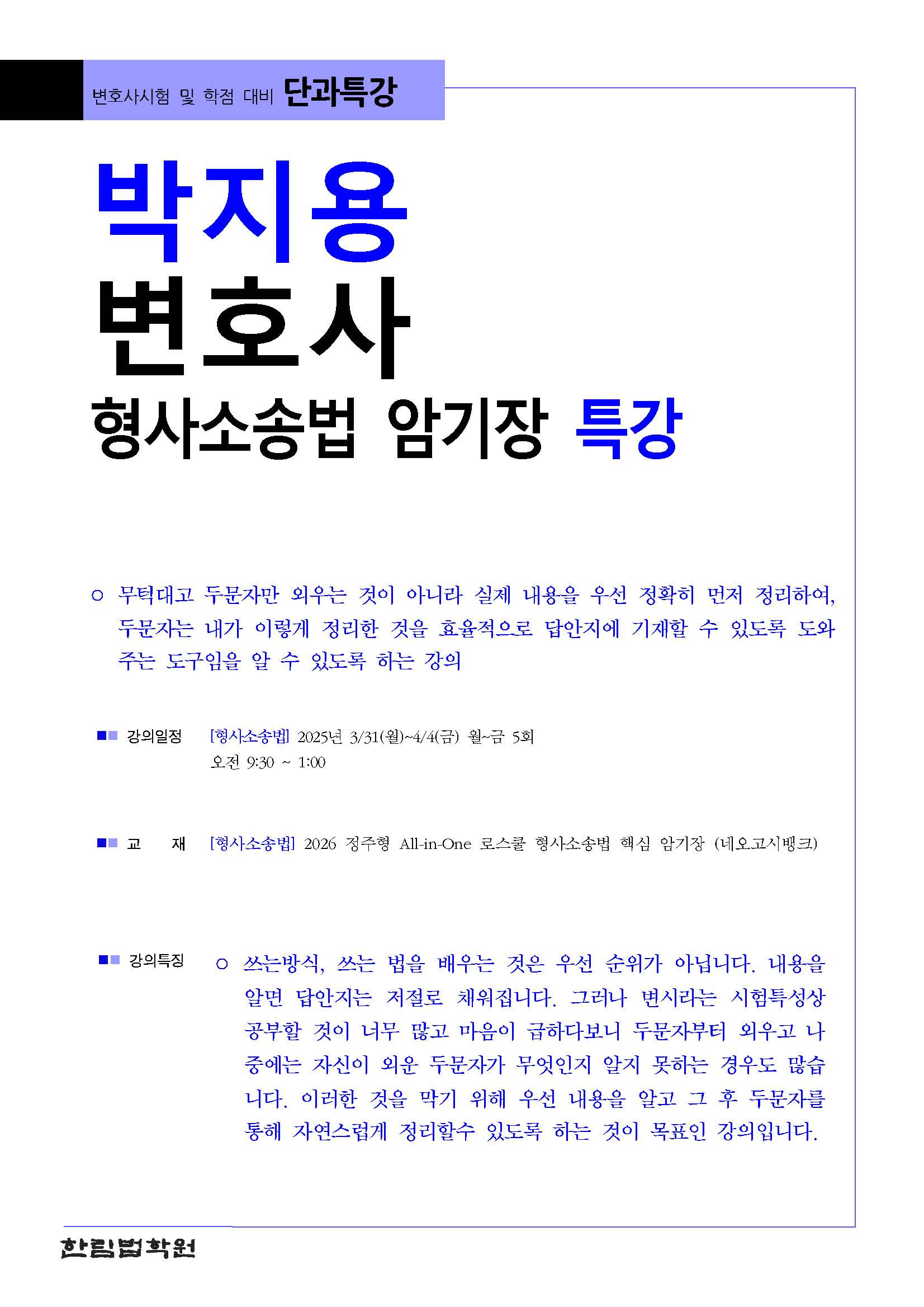 [특강] 박지용 변호사 형사소송법 암기장특강(3/31, 월) 작성자한림법학원|작성시간25.03.21|조회수93 목록 댓글 0 글자크기 작게가 글자크기 크게가 (0331)변시 박지용 형사소송법 암기장특강.pdf82.90KB 첨부파일첨부된 파일이 2개 있습니다. jpg 파일 (0331)변시 박지용 형사소송법 암기장특강.jpg 다운로드 pdf 파일 (0331)변시 박지용 형사소송법 암기장특강.pdf 다운로드 다음검색 현재 게시글 추가 기능 열기 북마크 공유하기 신고 센터로 신고 댓글 댓글 0 댓글쓰기 답글쓰기 댓글 리스트