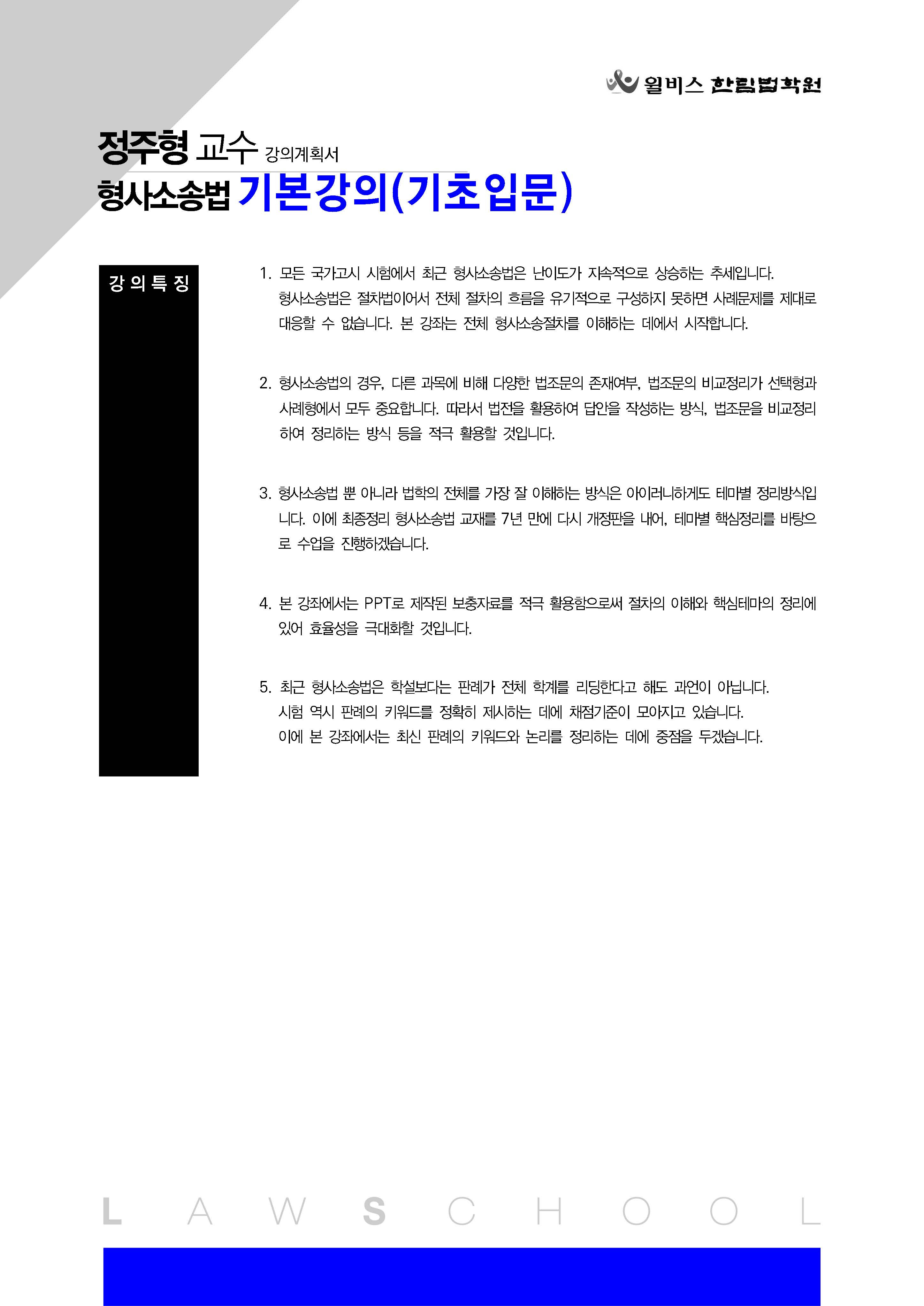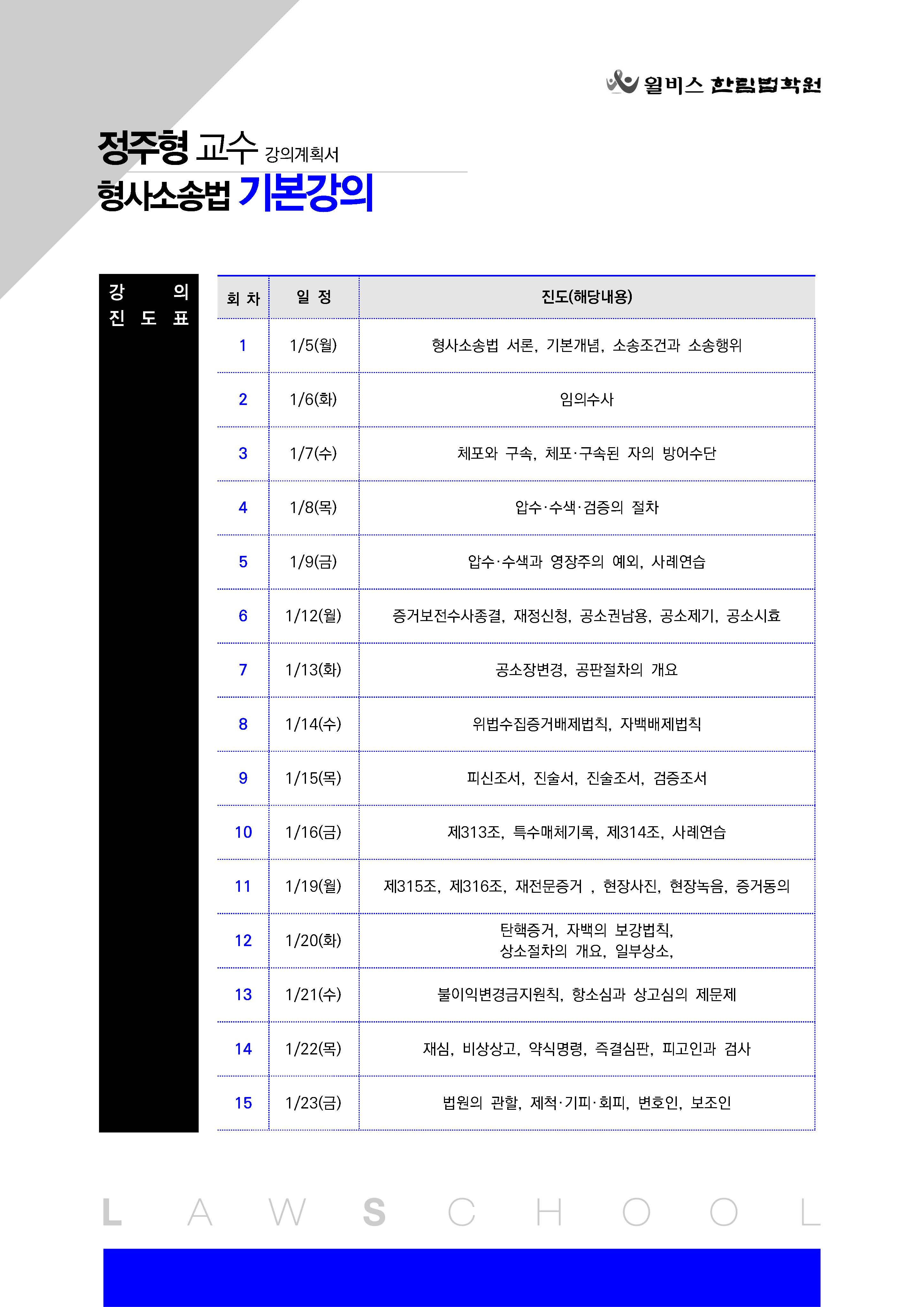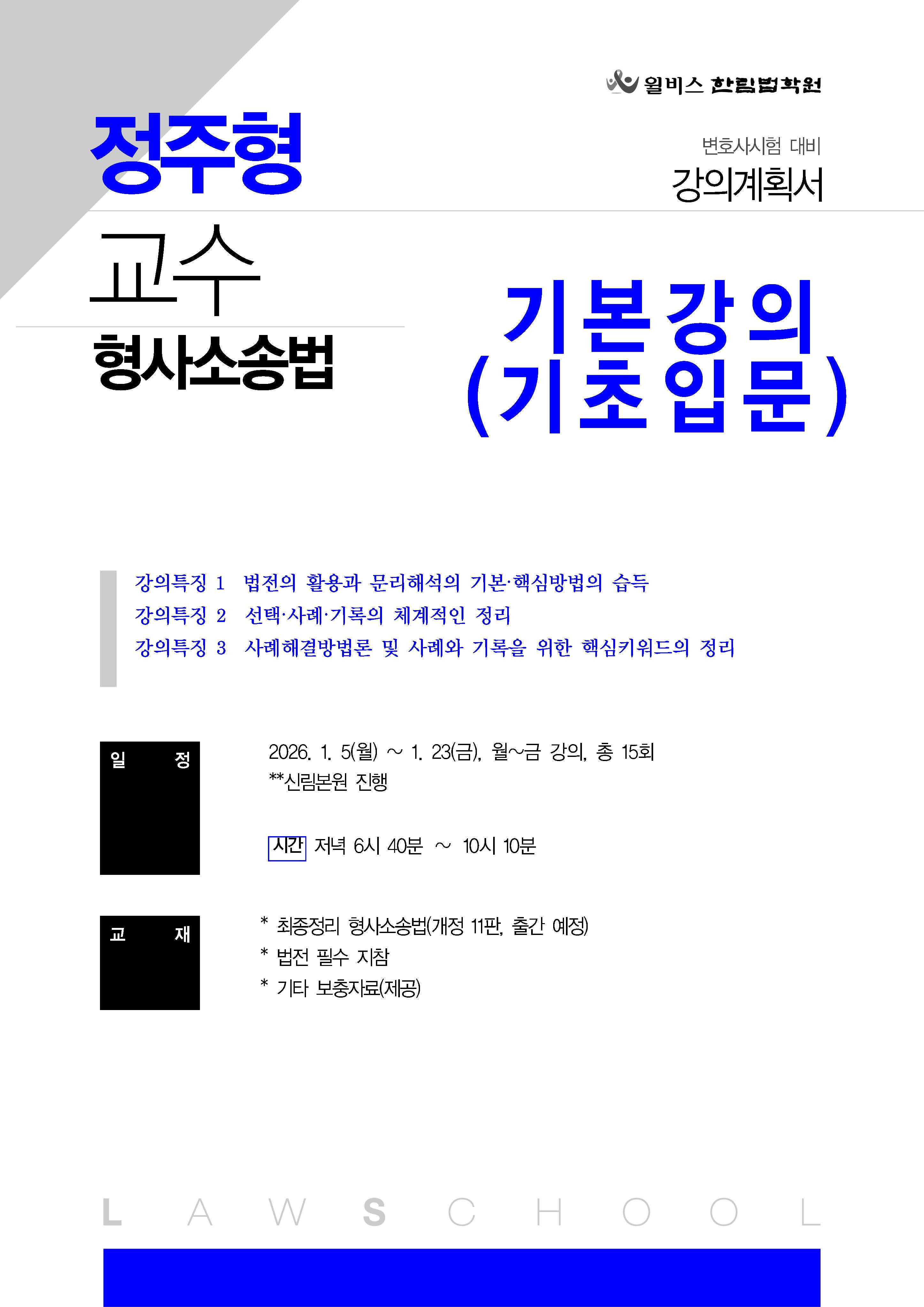 [겨울방학 선행학습] 정주형 교수 형사소송법 기본강의(1/5, 월) *신림본원진행 작성자한림법학원|작성시간25.12.26|조회수45 목록 댓글 0 글자크기 작게가 글자크기 크게가 (0105) 정주형 교수 형사소송법 기본강의(기초입문) 강의계획서.pdf181.25KB 첨부파일첨부된 파일이 4개 있습니다. jpg 파일 (0105) 정주형 교수 형사소송법 기본강의(기초입문) 강의계획서_페이지_1.jpg 다운로드 jpg 파일 (0105) 정주형 교수 형사소송법 기본강의(기초입문) 강의계획서_페이지_2.jpg 다운로드 jpg 파일 (0105) 정주형 교수 형사소송법 기본강의(기초입문) 강의계획서_페이지_3.jpg 다운로드 pdf 파일 (0105) 정주형 교수 형사소송법 기본강의(기초입문) 강의계획서.pdf 다운로드 다음검색 현재 게시글 추가 기능 열기 북마크 공유하기 신고 센터로 신고 댓글 댓글 0 댓글쓰기 답글쓰기 댓글 리스트