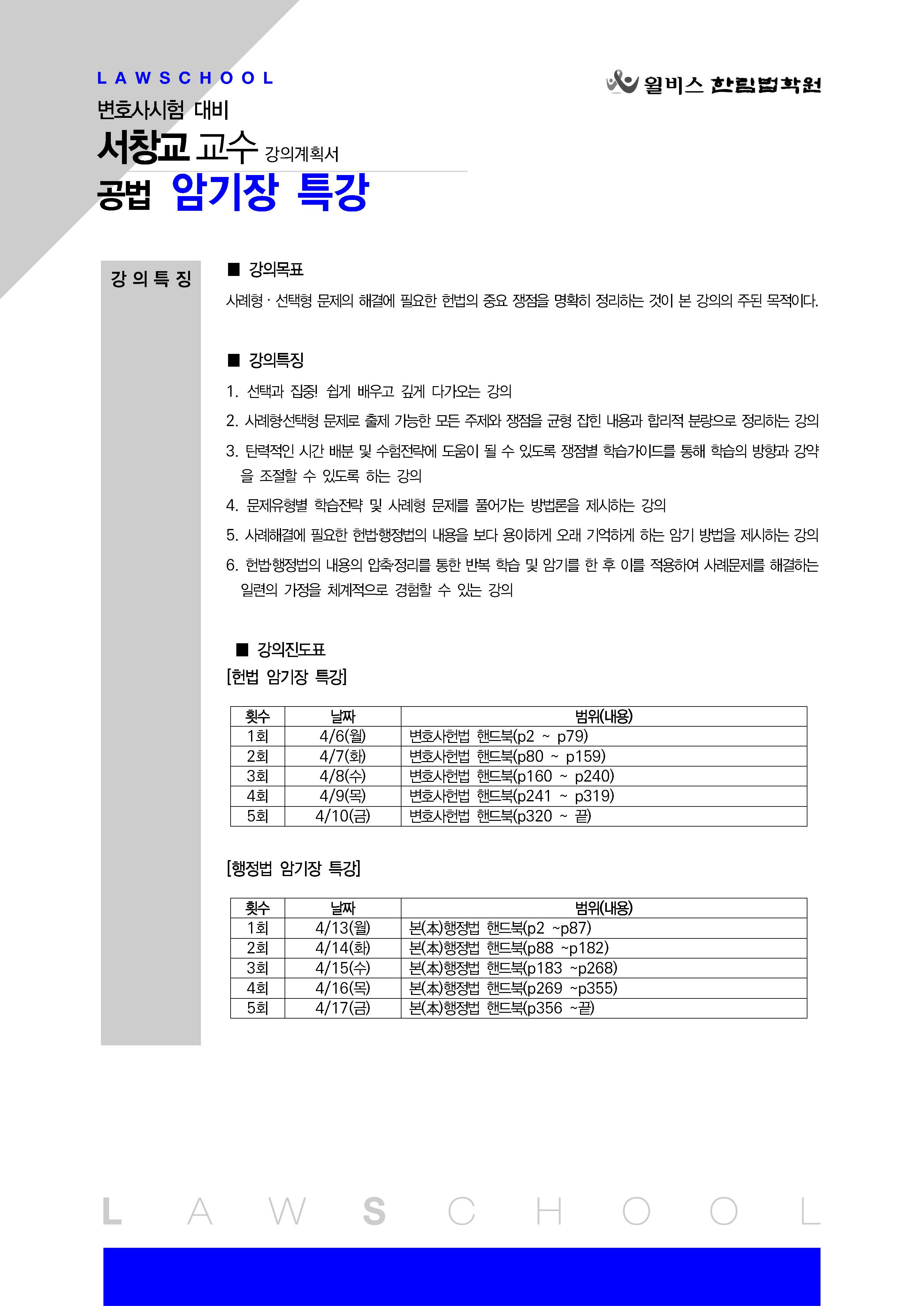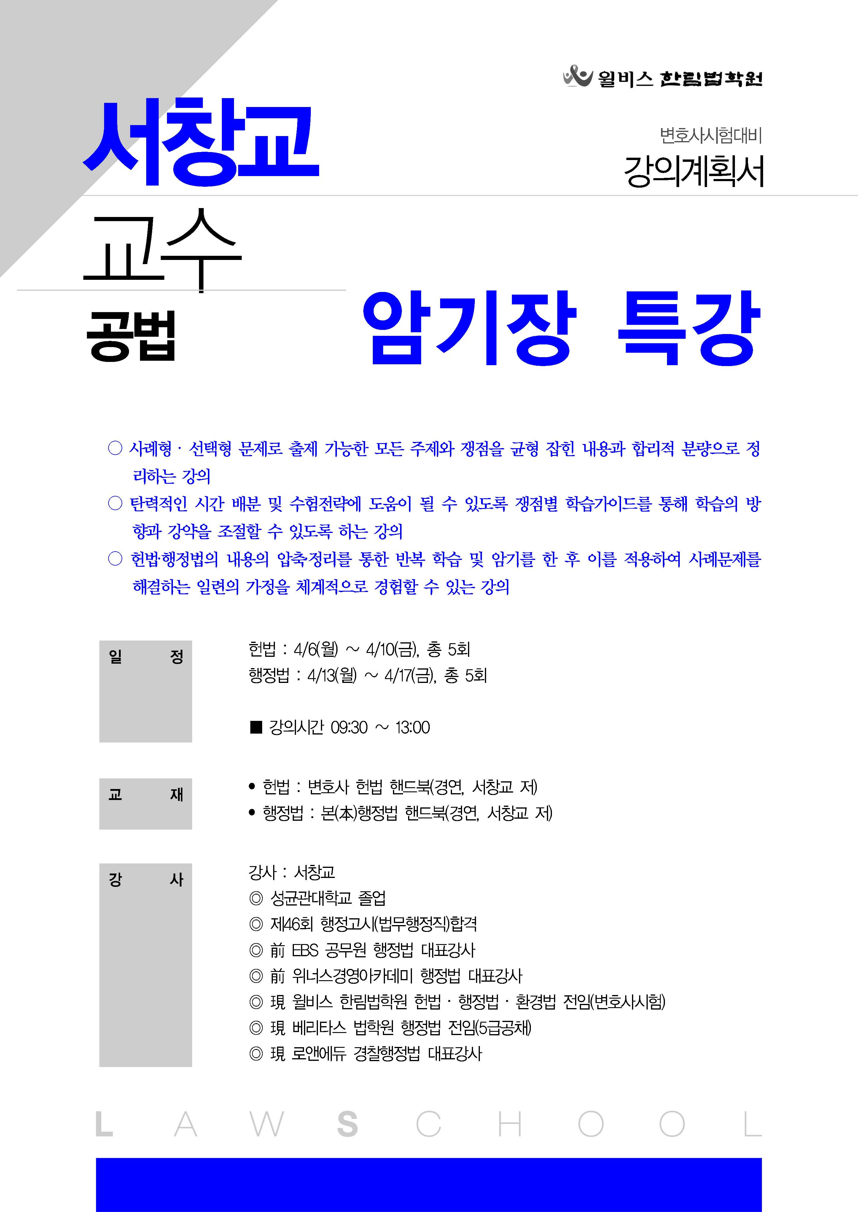[특강] 서창교 교수 공법 암기장 특강(4/6, 월) 작성자한림법학원|작성시간26.04.01|조회수24 목록 댓글 0 글자크기 작게가 글자크기 크게가 (0406) 서창교 교수 공법 암기장 특강 강의계획서.pdf128.64KB 첨부파일첨부된 파일이 3개 있습니다. jpg 파일 (0406) 서창교 교수 공법 암기장 특강 강의계획서_페이지_1.jpg 다운로드 jpg 파일 (0406) 서창교 교수 공법 암기장 특강 강의계획서_페이지_2.jpg 다운로드 pdf 파일 (0406) 서창교 교수 공법 암기장 특강 강의계획서.pdf 다운로드 다음검색 현재 게시글 추가 기능 열기 북마크 공유하기 신고 센터로 신고 댓글 댓글 0 댓글쓰기 답글쓰기 댓글 리스트